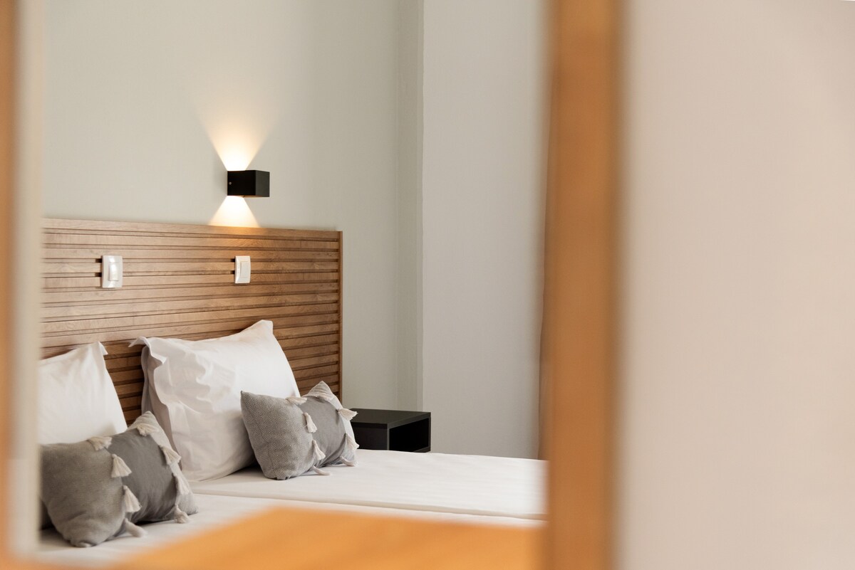 The Ares Room offers a peaceful retreat with direct garden views, located on the ground floor of Villa K Boutique Hotel. This stylish double room features a King-size bed, a modern ensuite bathroom with a walk-in rain shower, and a private patio with outdoor furniture for relaxing in the fresh air. Thoughtfully designed with minimalist elegance, Ares includes a Smart TV, A/C, Starlink Wi-Fi, premium bedding, and daily housekeeping ideal for couples seeking comfort and calm in a boutique setting.