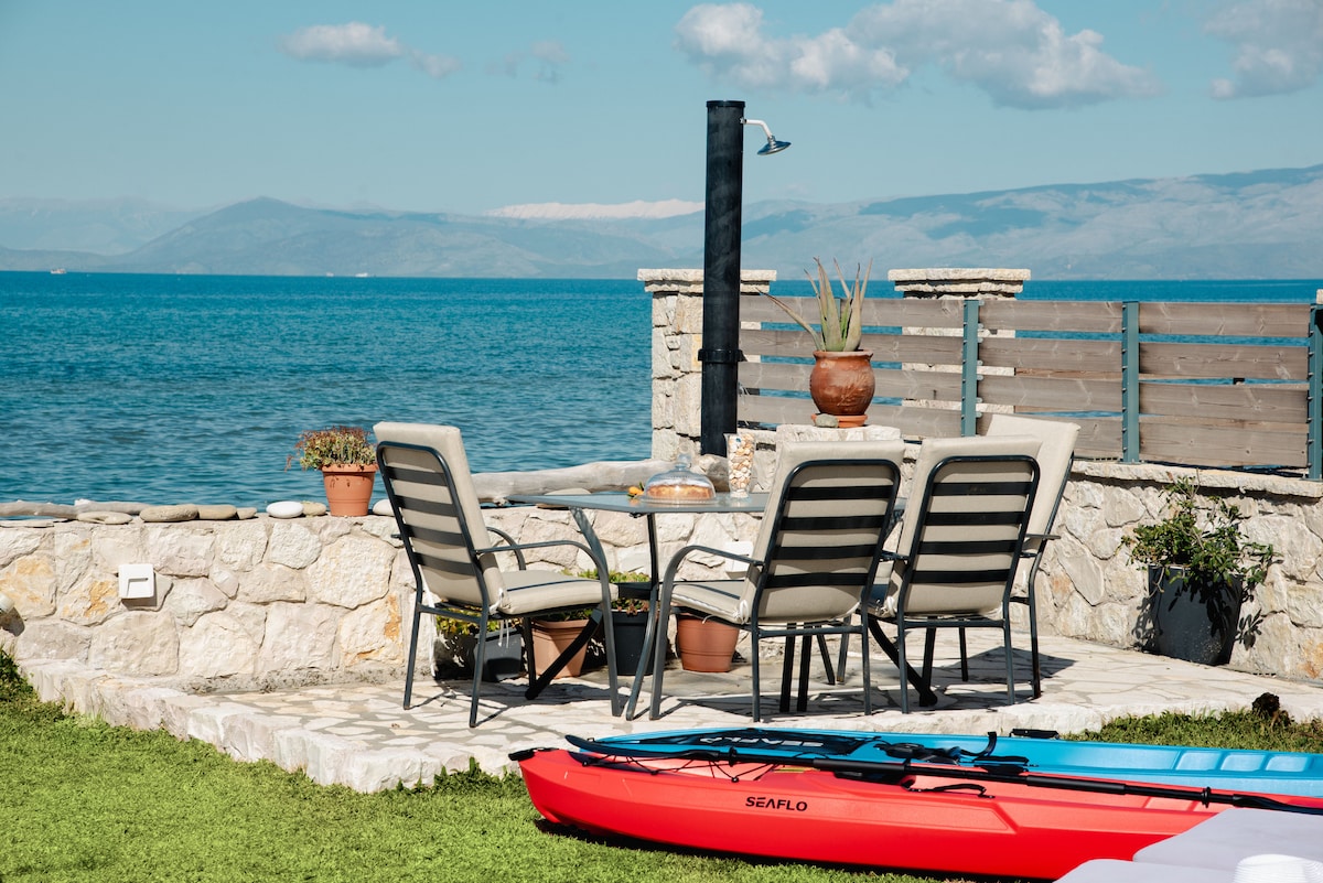 Thalassa beach house - stylish, modern and right on the sea Up to 5 guests, 2 double bedrooms, 1 single bed, 2 bathrooms Smart and open plan, Thalassa beach house is just on the beach at Coyevinas Bay. Set in a tranquil garden of orange and lemon trees, grapes, figs and olives it offers the perfect hideaway holiday for couples or small families. Popular Avlaki beach with its sailing school and two tavernas is close by. Kassiopi's shops,bars and restaurants are just 7 minutes away.