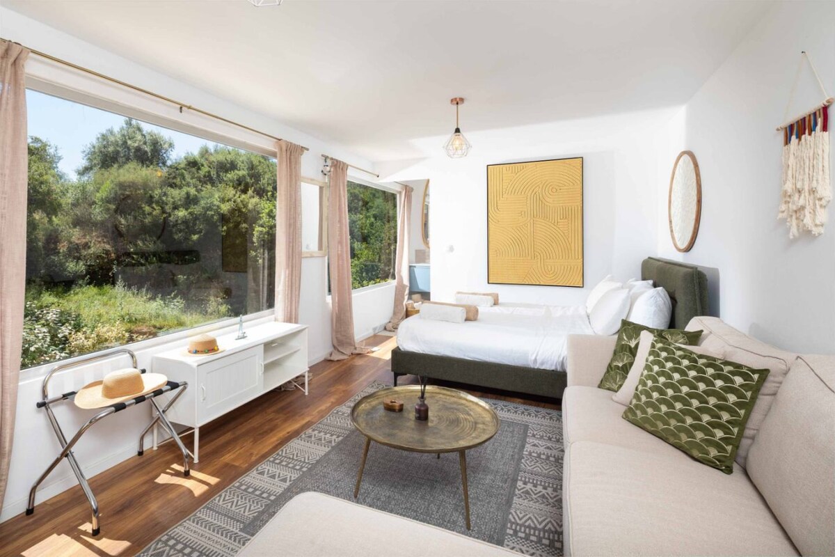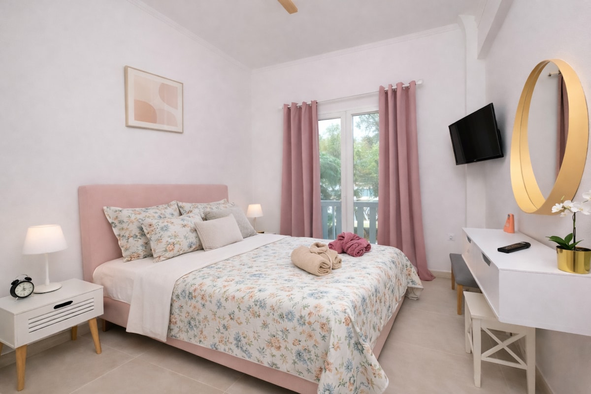 Experience the ultimate Ionian getaway in our brand-new studio. Perfectly located, it offers breathtaking views of the turquoise sea and the famous Kalami Bay. The space features a Queen-size bed, a cozy daybed, a kitchenette, and a private bathroom. Relax on your spacious balcony and soak in the sun. Best of all? You are just a 5-minute walk from the pristine beach and the charming village. Your unforgettable Greek summer starts here!