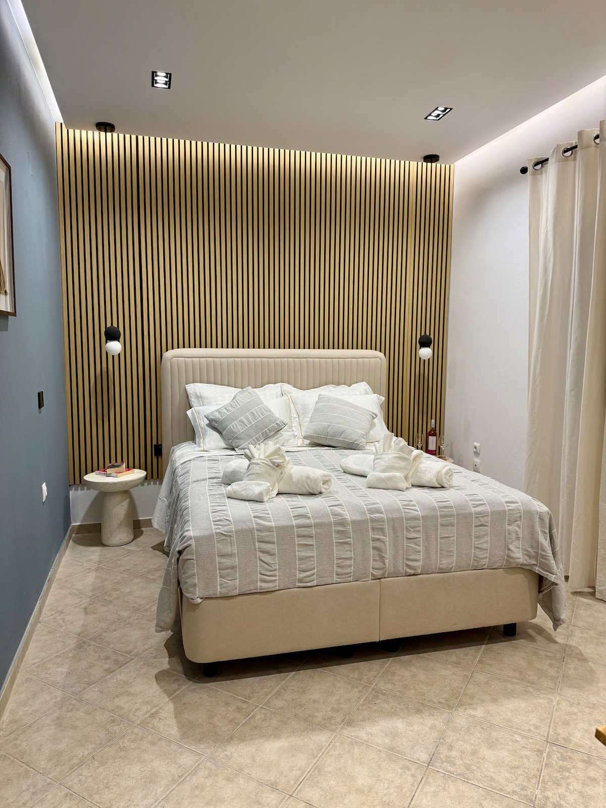 Studio with garden , ideal for couples , away from noizy streets 10 minutes walking from the beach ! The apartment is equipped with kitchen,air condition,private bathroom,wireless internet, Cable Tv 32 inches , private garden and free onsite parking ! The bathroom offers a shower, bathrobes and free toiletries. The kitchen is equipped with a fridge, kitchenware and a stove