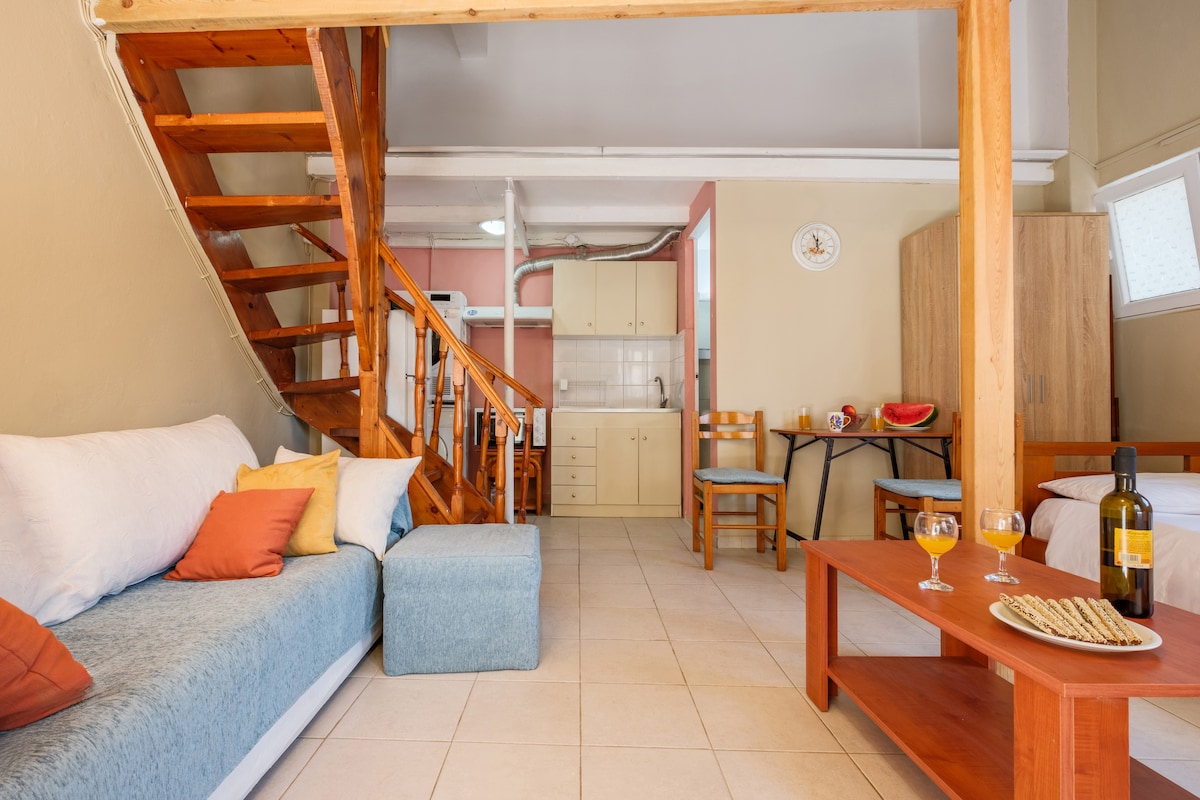 A beautiful and comfortable studio which includes a bedroom, a cosy kitchen, a bathroom and a private balcony with wonderful view! Reasons that my studio will like: light, comfortable bed and comfortable environment. My space is suitable for couples and families.Τhe complex consists of 5 studios and 2 houses.