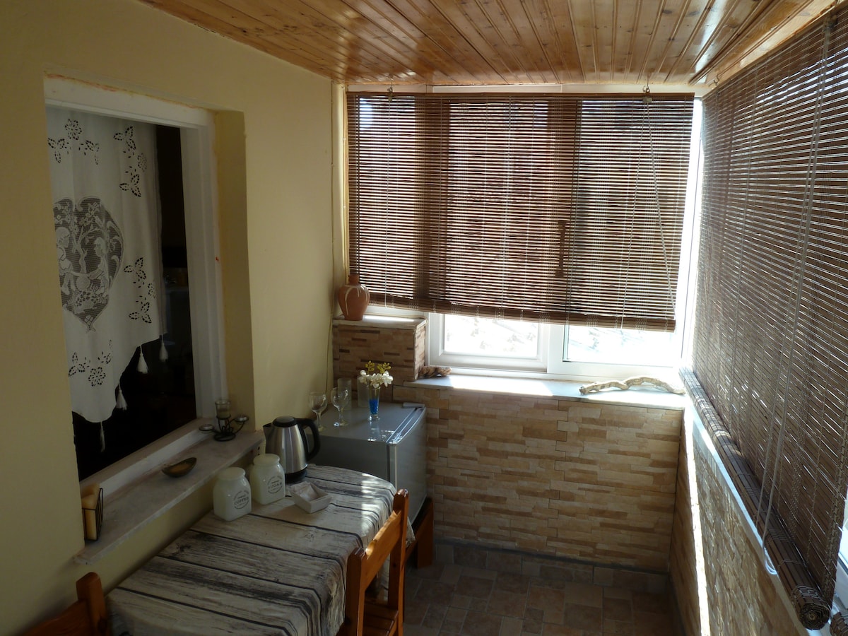 Kofineta studio is situated in the centre of Old Corfu town, on the top floor. The bedroom has a semi-double bed, bedside table and a big drawer unit. The bathroom has a shower and the dining/sitting area has doubled glazed windows and two armchairs creating a lovely, light and airey space. The studio is well supplied with free wifi, small fridge, air conditioning, kettle and drink making facilities , although there is not a kitchen . Kofineta studio is a non smoking area .