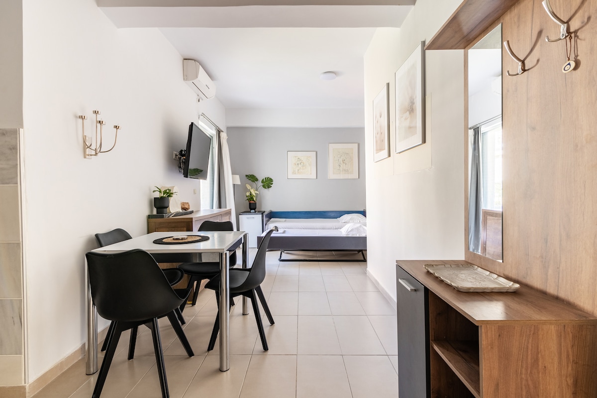 Όμορφο studio διαμέρισμα 32 m2 που μπορεί να φιλοξενήσει έως 3 άτομα. Τοποθετείται στην καρδιά της πόλης, σ' έναν ήσυχο δρόμο δίπλα στο πάρκο του Πνευματικού Κέντρου και 2' από τους κεντρικούς πεζόδρομους κ την πλατεία του Άρεως. Centrally located, sunny studio apartment that can accommodate up to 3 people. In the heart of Tripolis, next to the park (Pnevmatiko Kentro), only 2' walk to Areos square and the pedestrian streets