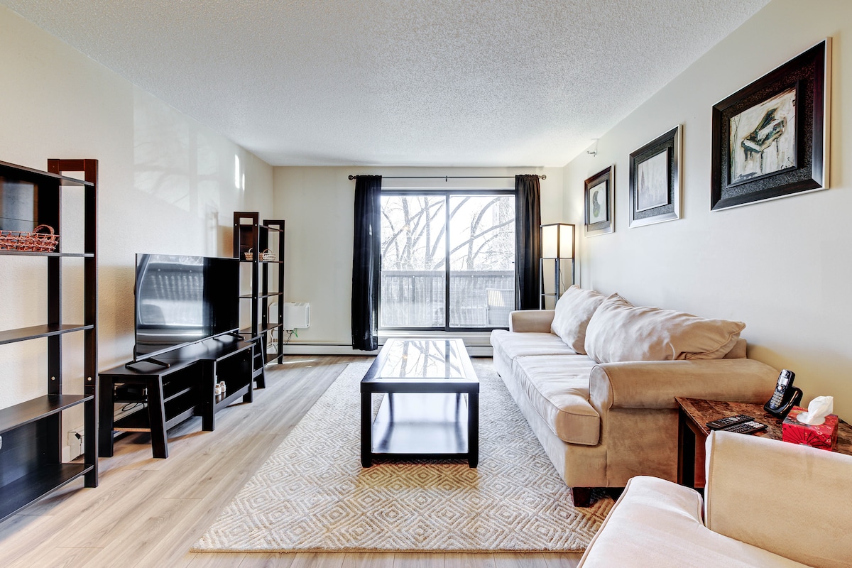 ★ Walking distance of all the Summer Festivals ★ A charming condo in the ❤ of city centre, business core, Midtown Plaza, TCU Place, farmers markets, parks, rRemai Gallery, restaurants/lounges, River Landing & great views within walking distance. You’ll love this space because of its coziness, numerous amenities & yes "the location" ★Minutes walk to everything downtown Saskatoon!!★ Ground floor 2 bedroom condo is an ideal space for couples, solo adventurers, business travellers, and families.
