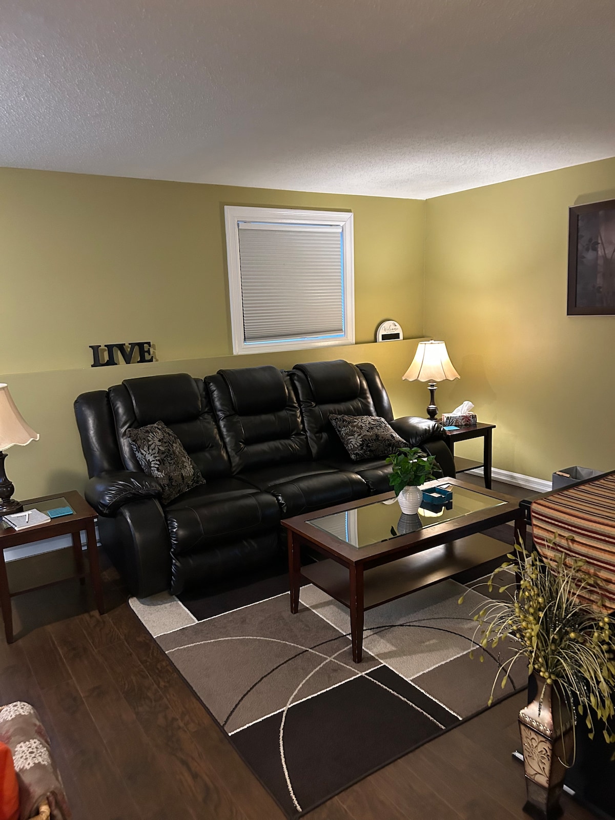 Relax at this DOG FRIENDLY home. This spacious rental unit has a private bedroom and a queen-size pull out couch if needed. The KITCHENETTE offers a bar fridge, sink, microwave, toaster, kettle along with all the necessary dishes. The french press provided is perfect for the locally sourced coffee. This cozy and comfortable basement suite also has some extra bonuses, such as an air hockey table, record player and treadmill. Cozy Corner also provides private parking and digital lock entry.