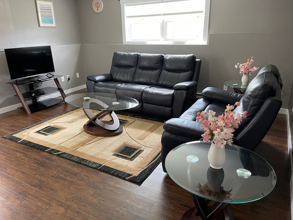 Relax at this DOG FRIENDLY home. This spacious rental unit has a private bedroom and a queen-size pull out couch if needed. The KITCHENETTE offers a bar fridge, sink, microwave, toaster, kettle along with all the necessary dishes. The french press provided is perfect for the locally sourced coffee. This cozy and comfortable basement suite also has some extra bonuses, such as an air hockey table, record player and treadmill. Cozy Corner also provides private parking and digital lock entry.