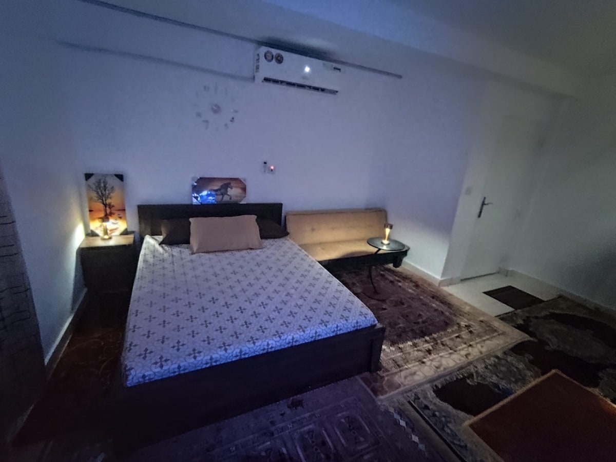 Stylish, spacious studio near Zayed Airport with decorative walls, a fully equipped kitchen, strong AC, WiFi, IPTV & big TV. Sleeps up to 4 with a double bed, bed loofa & floor mattress. Includes workspace, clean bathroom, shaded parking & a cozy rooftop corner for relaxing nights. Calm, clean, and respectful neighborhood. Close to supermarket & Makani Mall. Just 35 mins to major cultural spots. Perfect for comfort, work, and leisure.