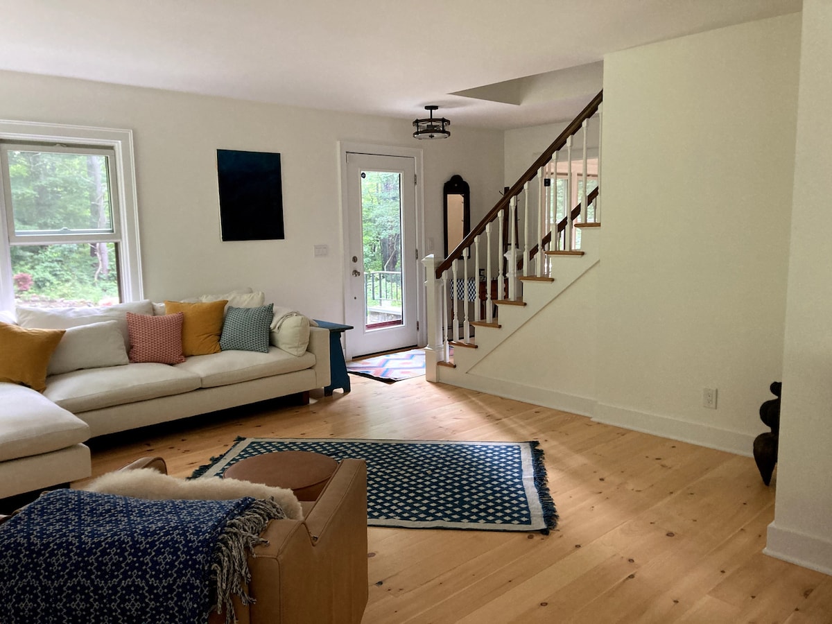 Summertime in beautiful Sharon! Comfortable, rustic cottage with fire-pit, wood-burning stove, large deck for star-gazing, 4 acres, a brook and private path to 200' Housatonic River frontage. So cozy! In lovely Litchfield Hills, covered bridges, lake swimming, restaurants, the Appalachian trail and hiking trails, ski areas, Audubon Center, Clarke Outdoors tubing/ kayaking and Ellsworth Farms fruit picking. Near Millerton, Kent, Great Barrington. Lake beach pass included in the rental.
