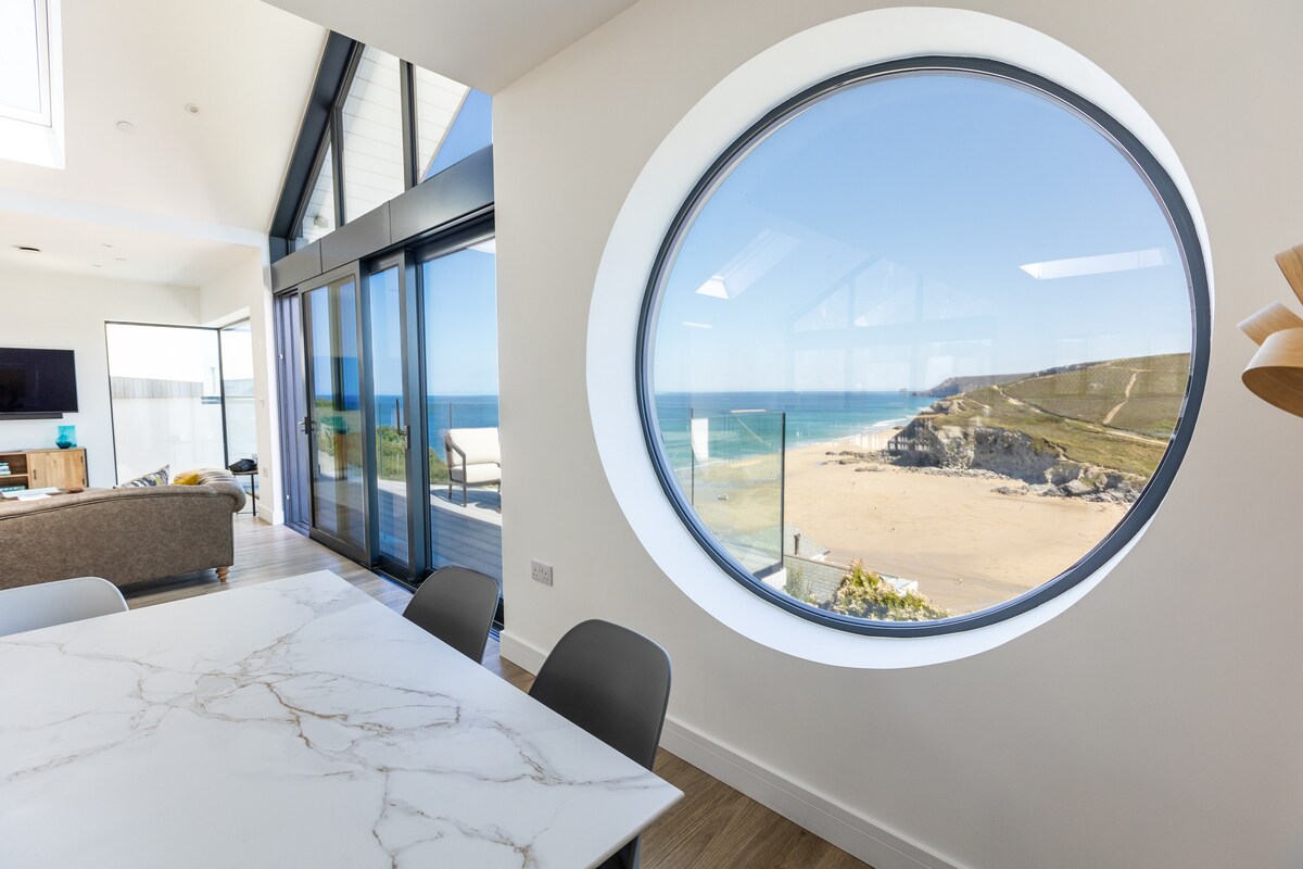 Pentire is a large, five-bedroom detached modern retreat with open-plan living and breathtaking sea views. It sits on a cliff overlooking the charming seaside village of Porthtowan and its pretty sandy, Blue-Flag beach a few minutes walk away. The village has a lovely relaxed, off-the-beaten-path feel with a selection of cafes, pubs and restaurants, plus surf hire / lessons and great walks to nearby beaches along the coast path. St Agnes is accessible by foot on the coast Path or a short drive.