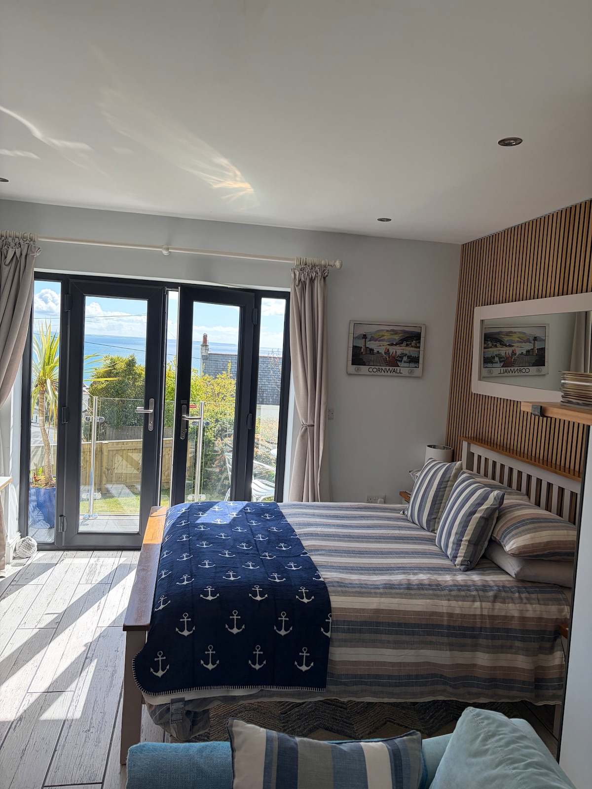 Stylish Beach house Studio overlooking the stunning bay 3 mins walk to an excellent pub or 2 fab beach cafes Amazing views from every window & you can hear, see and smell the salty sea from your comfy bed ! Relax & watch a beautiful sunset over the sea with a drink or bbq in your own garden area with its bench & table Self contained with key Venture out to the beach & watch the surfers climb the coastal path & discover a secluded bay Or explore a woodland walk … Just enjoy beautiful Cornwall