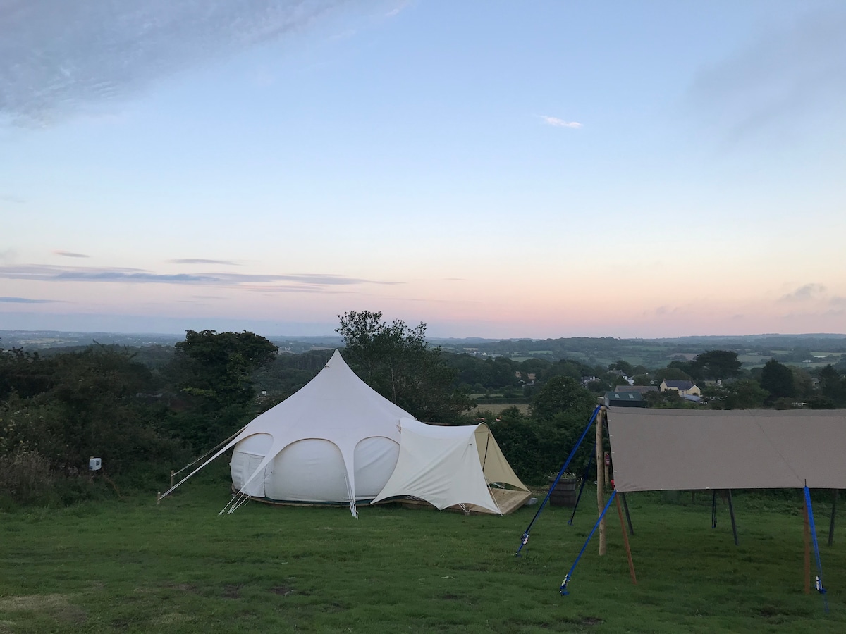 A Luxury Hotel Room in a Tent with a field to yourselves! Fabulous Lotus Bell in exclusive private field with stunning country views, trees, meadows & tin mines silhouettes. 10mins drive to popular surf/swim beaches. Ideal for couples & families. It sleeps 2-4 in king/sgl. HOME COMFORTS incl. Free Wi-Fi /USB's mini fridge, kettle, tea, coffee & sugar. Chairs, 2 sun loungers, picnic table, BBQ/Fire pit, camp stove/grill, pots/pans/plates, knives & cutlery. Dogs can roam free. Truly idyllic spot!