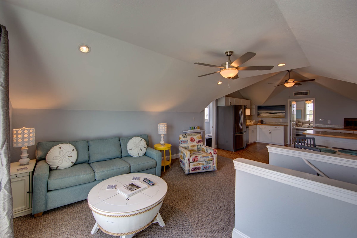 Please read entire listing! This top level apartment is perfect for the beach lover! Inside you will find 2 bedrooms and a large eat in kitchen. There is an ocean facing living room with a large tv that opens up to the dining and kitchen area. 1 King Bed -1 w/ bunkbeds, max occupancy 4. *bed/bath linens NOT included *available for additional fee *min. starter supplies included *2 Dogs limit w/APPROVAL & $150 pet fee PER DOG. *guests age 24+ (children welcome) Checkin 4pm Check out 10am