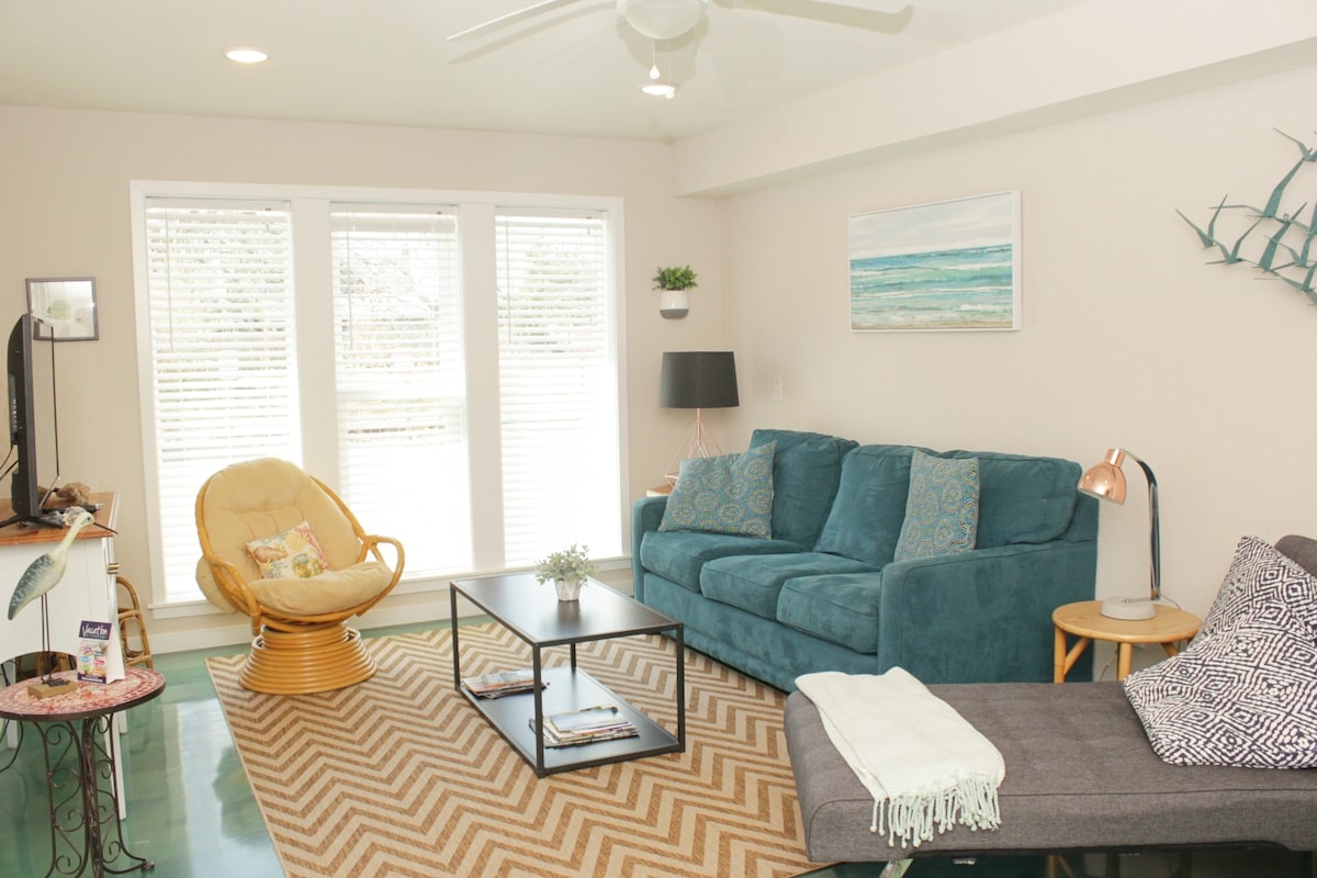 This unit has been nick-named the Green Floor because of the gorgeous emerald green stained concrete floor in the living space. Furniture and decor is modern, beachy, and comfortable all at the same time. The perfect location for your stay in Duck. Right in the heart of downtown Duck, there is no reason to use your car while here! Walking and biking distance to the beach, the sound and the boardwalk, and all great shopping and delicious restaurants Duck has to offer! QUIET HRS 10PM-7AM