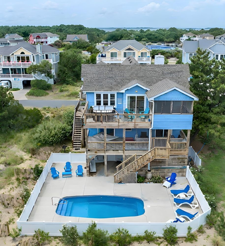 Sparkling and renovated 4 br/3 ba beach home is a 2500 ft2 tree house come to life w/ 6 decks, chef’s kitchen with open plan layout and 20’ ceilings, private pool (heat opt) with gas BBQ, screened in porch and upper hot-tub for star gazing. Spa-like bath with soaking tub and fireplace. Stunning beaches and quaint soundside sunset pier are only a short stroll or bike ride away. Conveniently located minutes from shops, restaurants and attractions while blissfully retaining the solitude of Corolla.