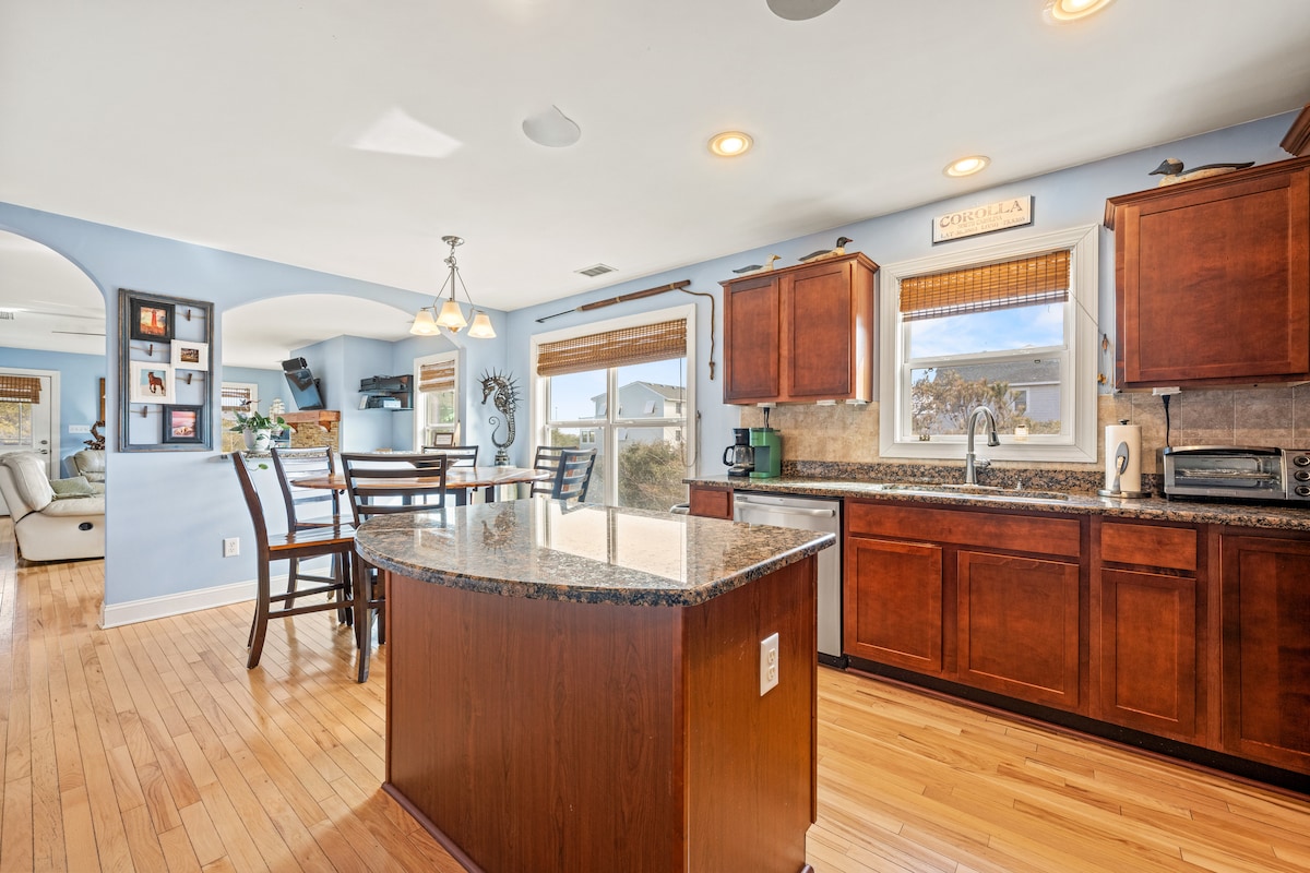 Keep it simple at this peaceful and centrally-located place. A 3 minute walk to the beach access. A 5 minute drive to Timbuktu shops, Corolla's BEST restaurants/grocery stores. You will have an umbrella, chairs, cooler, towels, boogie boards, and can koozies provided to enjoy the beach! With a sound system that can be heard in all common areas of the home as well as the porch, checkout Sean's!