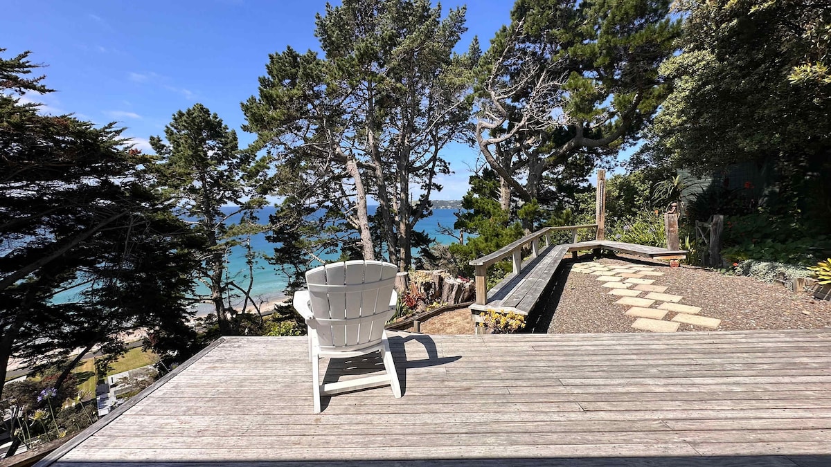 Give yourself a beach holiday like no other. An elevated site, nestled in the trees. You will wake to bird song and a full unobscured view of the beach. The property features 3 rooms with beach views, a very large open living area and expansive deck perfect for a BBQ. The house is naturally sheltered from the predominant westerly wind meaning you can make the most of the outdoor space. The beach is only a 5 minute walk away and the stream provides safe swimming areas for children.