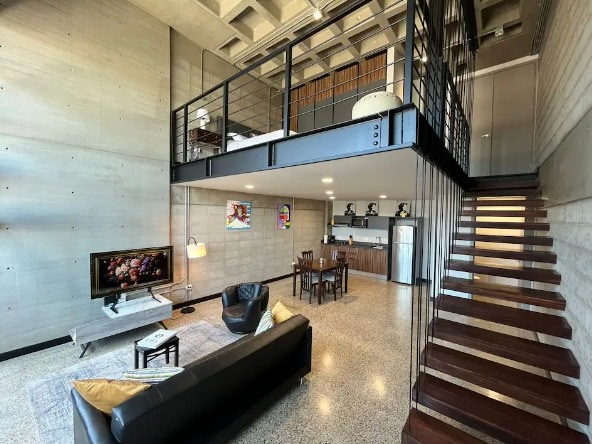 Elegante loft con paredes de concreto, vigas de acero y acabados de madera y un ambiente botánico pintando un estilo fresco e industrial. En la recámara disfruta de una vista enorme de la calle más histórica de Tijuana. Sube a la azotea para disfrutar de un concierto y vistas de las calles junto a una fogata. Seguridad 24/7 y acceso solo con tarjeta. Experimenta la ubicación más céntrica de Tijuana donde clínicas, supermercados, bares, restaurantes y cafés a menos de 5 minutos a pie.