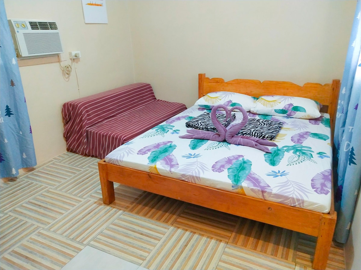 the room's pastel color calls a feeling of calmness and purity. It has a big sized window with a view of the town. It has a comfortable queen sized bed and a double deck of single sized beds. The room also has its flat TV with cable channels and WIFI connection. Free breakfast with free coffee, tea and fruit juice awaits when you wake up in the morning. The host's daily presence will even make you have a very homey and comfortable stay during your vacation