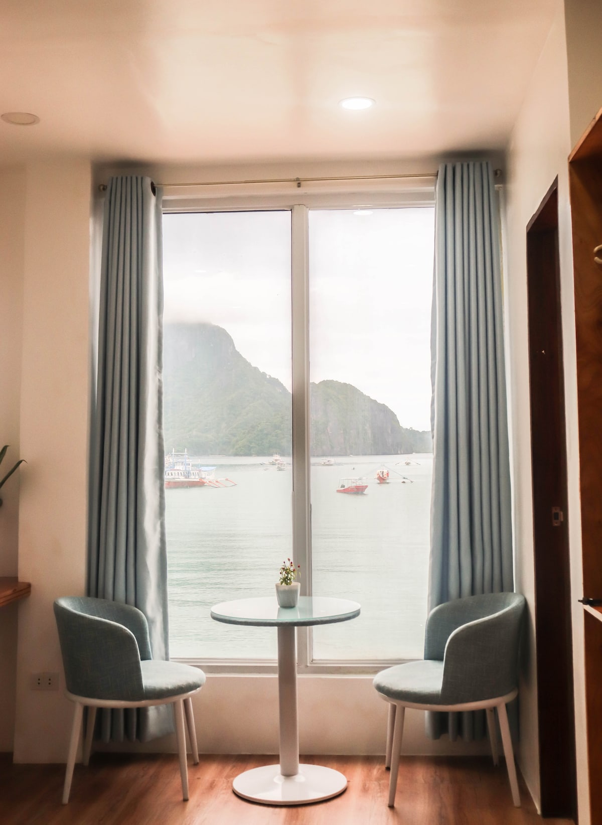 Discover our 50 sqm ocean-view suite overlooking El Nido Bay. Newly refurbished with contemporary design, it offers a king-size bed with premium linens, air-conditioning, flat-screen TV, high-speed Wi-Fi, and a kettle with coffee and tea. The marble bathroom features dual sinks and a walk-in rain shower. Floor-to-ceiling windows and a private balcony showcase panoramic sea and island views. Ideal for couples or solo travelers seeking comfort and stunning vistas.