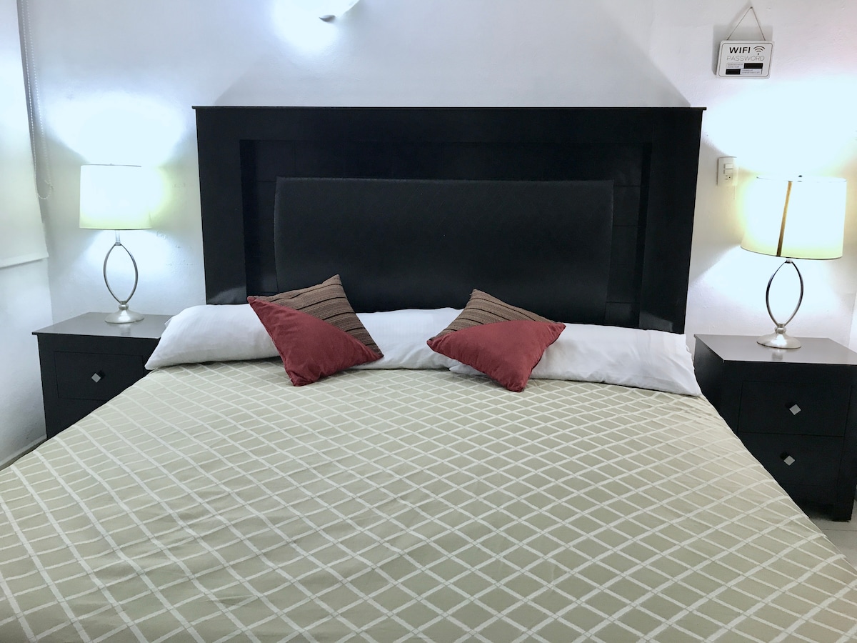 Apartamento tipo estudio cuenta con una recamara, con TV Smart te incluimos Netflix, cuenta con baño con servicio de agua fría y caliente. Todo el confort que encontrarías en casa. Proporcionamos garrafon de agua a disponibilidad de acuerdo a uso de los huéspedes, estancias largas cerca de casa hay donde surtirlo. Nuestro alojamiento tiene ubicación estratégica para moverse para asuntos de trabajo, servicio médico o vacaciones. Ideal para descansar.