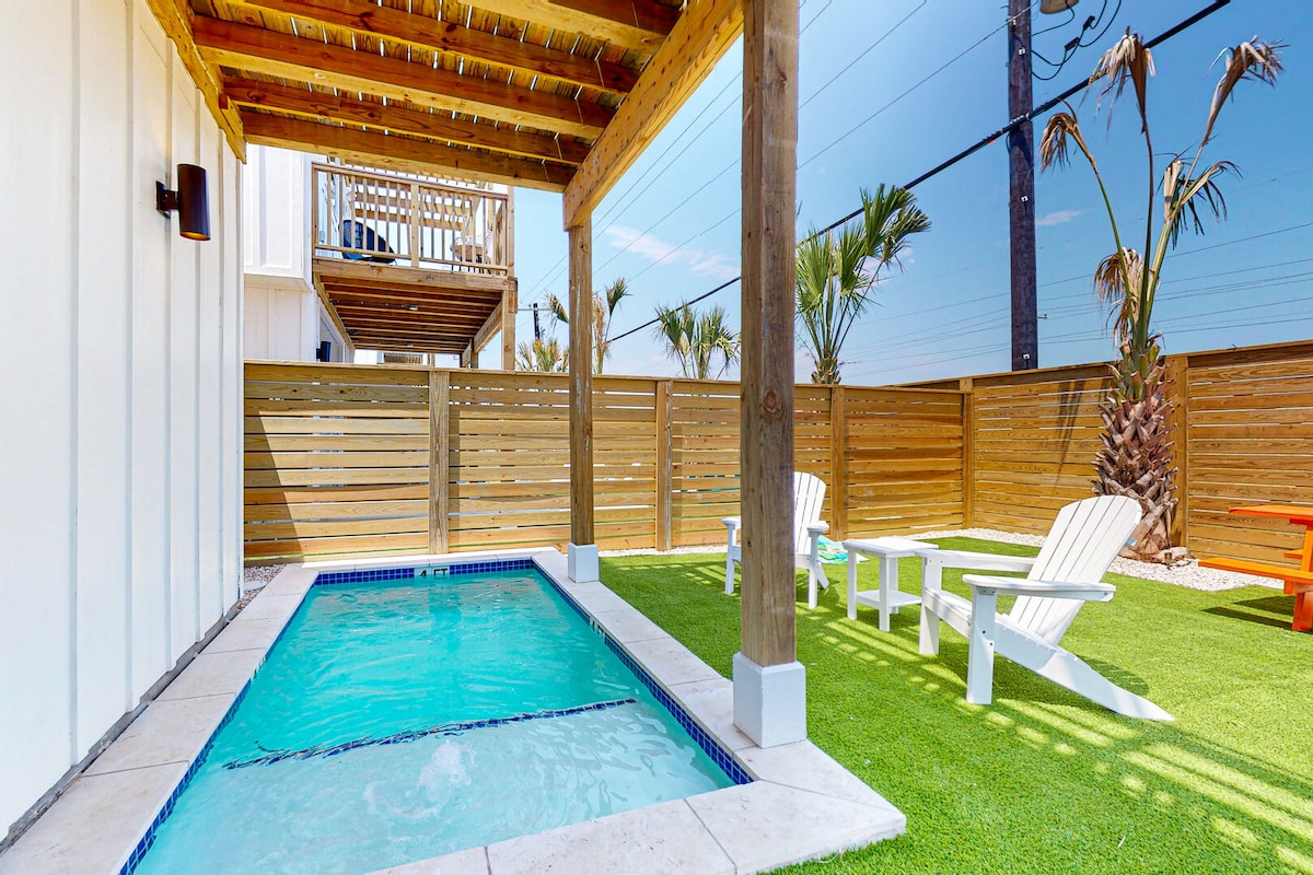 New townhome where European elegance meets Texas beach vibes. Whitecap Beach is 1.5 miles away & we offer the option to rent our golf cart that's in the garage. For guests who like to cook we have a fully equipped kitchen & gas BBQ grill. For families with kids we offer a high chair, pack n play, games & toys. For the beach lovers we have canopy tent, chairs, beach cart & beach toys. SUPs and kayaks for active guests! Enjoy a drink by the private lounge pool and relax on the romantic patio!