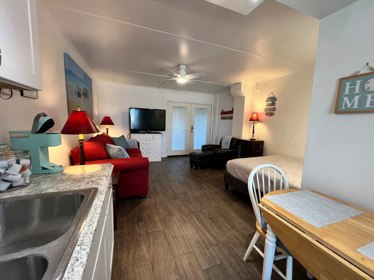 Experience a peaceful getaway in this newly remodeled, first floor studio condo on North Padre Island only a short 5 minute walk to the beach. This cozy condo features a beautiful and fresh design, including a king size bed and queen sleeper sofa accommodating up to 4 guests. You will also enjoy a full kitchen, full bathroom, dining and living area with 4K TV. There are many shared condominium amenities to include pool, hot tub, sauna, gym, bbq and more. Enjoy a peaceful beach getaway today!
