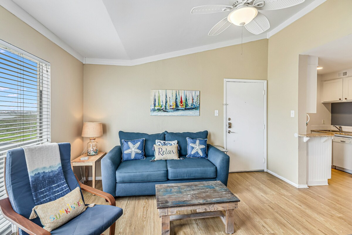 Welcome to the “Blue Gull!” You will find everything you need for a perfect beach getaway in this cozy 1 bedroom condo! We are perched on the 3rd floor and with that comes tall ceilings, a balcony with a view of Lake Padre, and a peaceful quietness. While the condo is within walking distance to the beach (5 minutes), you can also have a vacation without leaving the complex. The community offers many other amenities...hot tub, heated pool, sauna, fitness center, etc. What’s not to love?!?!!!