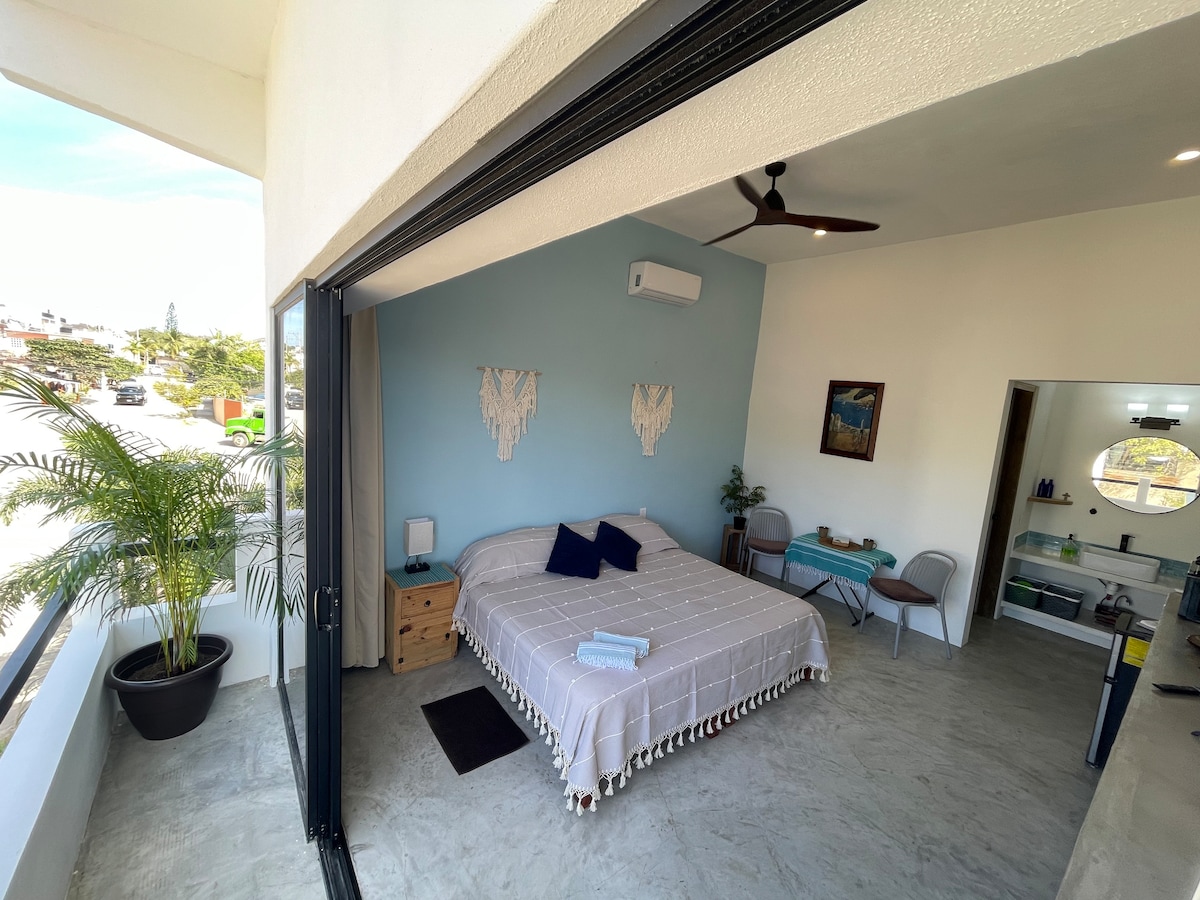 Enjoy a stylish experience at this centrally located Studio Suite with easy Beach access! (3 min walk) Offering 1 King size bed or 2 Single beds. Kitchenette well stocked for all your cooking needs. Watch Beautiful Mita Sunsets from your 2nd floor outdoor Balcony! Spacious Vanity area, large Shower with stone base. Taco stands to Restaurants all within a short stroll. You’ll love your comfortable stay here!! Surf boards, golf cart or Paddle board for rent as well, please inquire. 😉