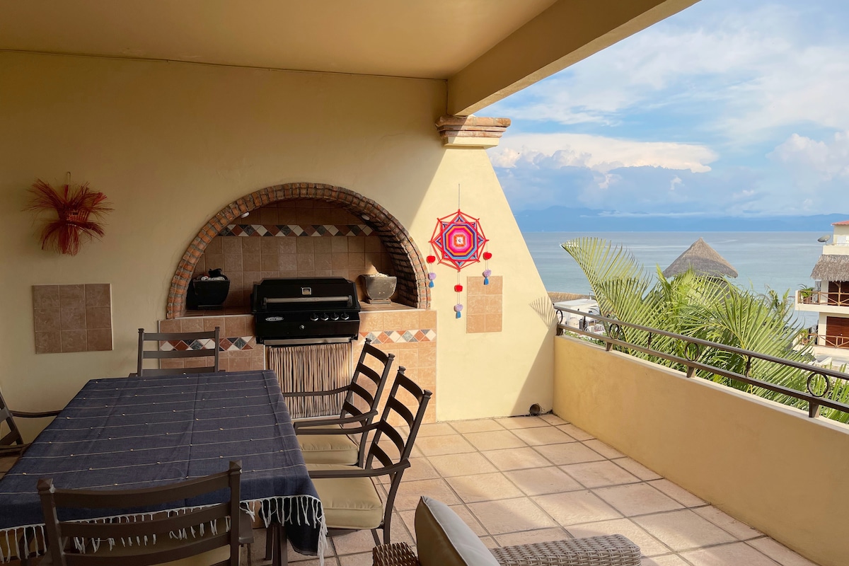 Plunge into the private refreshing pool and marvel at the panoramic views across the bay. This villa reflects old-world Mexican sophistication featuring exposed wooden beams, hand-painted tiles, and colonial antiques alongside contemporary amenities. Our villa sits high on a mountain ridge with panoramic views of the Bay of Banderas, Puerto Vallarta to the north and Los Arcos to the south. The location and collection of villas is widely acknowledged as being some of the best PV has to offer due to the unparalleled location and the gorgeous architectural details of our enclave of villas. This is authentic coastal Mexico -- all the modern luxuries in a stunning setting. It is our paradise and home away from home, and we take great pride in sharing it with our guests! The villa is yours! From front to back and top to bottom! I am always available by email. We also have a property manager in PV, a housekeeper, gardener/pool boy, and regular maintenance services. As a result any issue that comes up can typically be handled quite swiftly by our local staff. Our maid cleans twice weekly as a part of our rate, the pool/garden service occurs every other day, so guests typically have someone to help them and talk to, with any needed manner. Our staff has been with us for many many years and are quite skilled and experienced in serving our guests. This villa is on Puerto Vallarta's South Shore, which is set among mountains covered in a lush jungle next to Banderas Bay. It's an upscale area filled with incredible nature and luxurious homes. Some of the best beaches are right outside the door. Our secluded and exclusive gated villa community is just moments from Puerto Vallarta's charming and historic Romantic Zone, minutes from town and only ten miles from Puerto Vallarta Airport. Cabs are readily available and for $7 you are in town in ten minutes. The coastal road bus stops in front of our villa enclave every 15 minutes, and for $0.50 you can be in town in 10 minutes flat!! Private parking is included. The villas have security on the premises from 7PM to 7AM every day. Any problems or questions that arise in the evening, can be handled by our security staff. For families with small children, we have pack-n-play cribs, boogie boards, beach towels, and other gear needed for guests who love the beach!