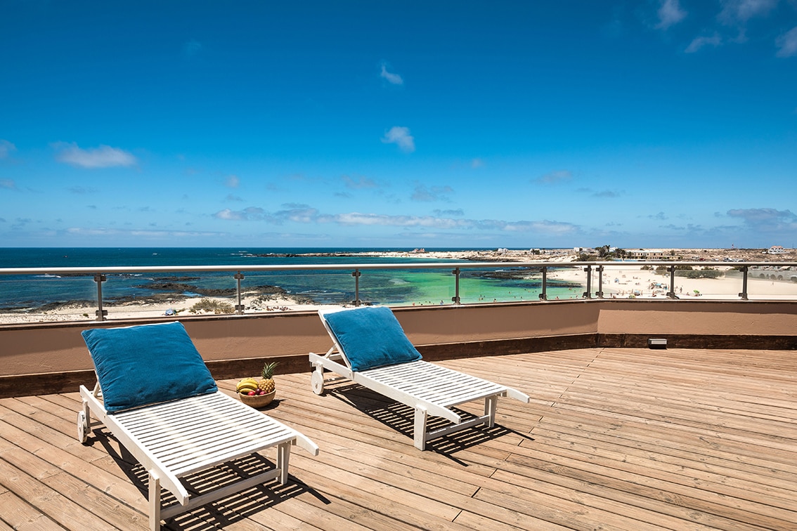Modern ground floor apartment situated directly on one of Corralajo's white sandy beaches with magnificent views to Lobos and Lanzarote. 2 Double bedrooms with on-suite bathrooms, a large sunny and wind sheltered terrace with shaded lounge area. Fast Fibre optic Wifi with 300 mbps. New Air conditioning installed throughout the apartment in 2022. The apartment is located in the Hoplaco gated community complex offering a quiet, safe environment whilst having all the benefits of beach life!