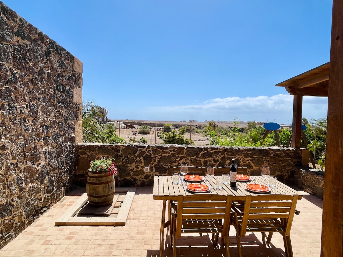 A sunny Canarian cottage, very cozy and fully equipped. Enjoy the sea-view in our little oasis and the breathtaking sunsets from the comfort of your terrace. The long sandy beach and El Cotillo (a relaxed small surf and fishing town), are located in 10-mins walking distance. From every window there is an incredible view over the sea or the volcano landscape, resembling scenes from Wild West cowboy movies. The house is placed on a little ranch in El Roque, on the West Coast of Fuerteventura.