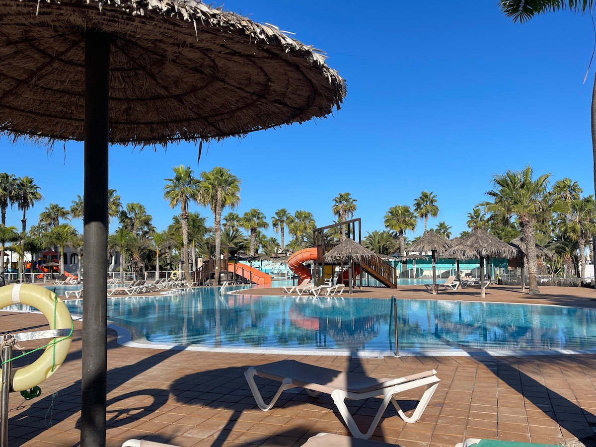 This independent flat is very quiet and fully equipped, inside a newly renovated resort built on the ashes of the historical old building known as "Hotel Corralejo", the famous hotel which was the hype in the 70s. The flat is on the ground floor; there are one bedroom, one living room and one bathroom. The terrace, facing the backyard and two pools - one of which is a jacuzzi, has a table, chairs and a cozy couch to eat outside or just chill and relax after a day spent at the sea or exploring.