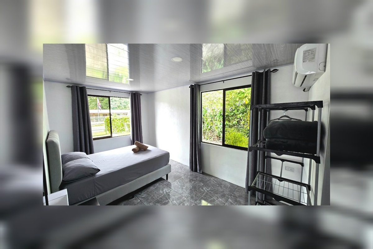 Espacio para grupos familiares o amigos de hasta 15 huéspedes, habilitando la casa de al lado con 2 cuartos con A/C cada uno, 1 sala con A/C, 1 baño, 2 camas matrimoniales y 1 camarote individual, y parqueo gratis para varios autos Cuenta con toma corriente 220 V para cargar autos eléctricos Trae a toda la familia y amigos a este bonito lugar a descansar y pasarla bien, además, estarán muy cerca de los principales centros comerciales y supermercados de Paso Canoas, donde podrán hacer compras