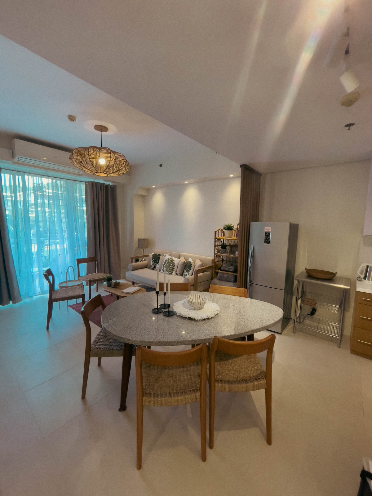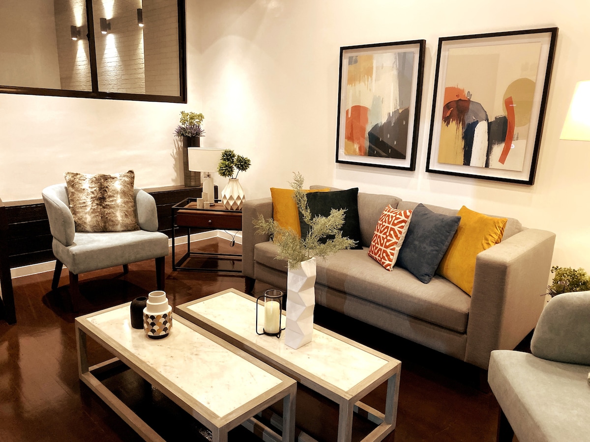 *Lovely 55 sqm 1 bd quality unit in Myna B, separate kitchen layout, cozy bedroom -LR/DR combo, with balcony and sink & patio furniture to dine out. *Unit has hot & cold water in the shower room *55 " Samsung Curved UHDTV, internet connection up to 400 mpbs *Fully equip kitchen w/ toaster, rice cooker, kettle, ref, microwave, air fyer, plates & glasses of your choice, kitchen towels, dish soap. *Free guest parking & with internet.