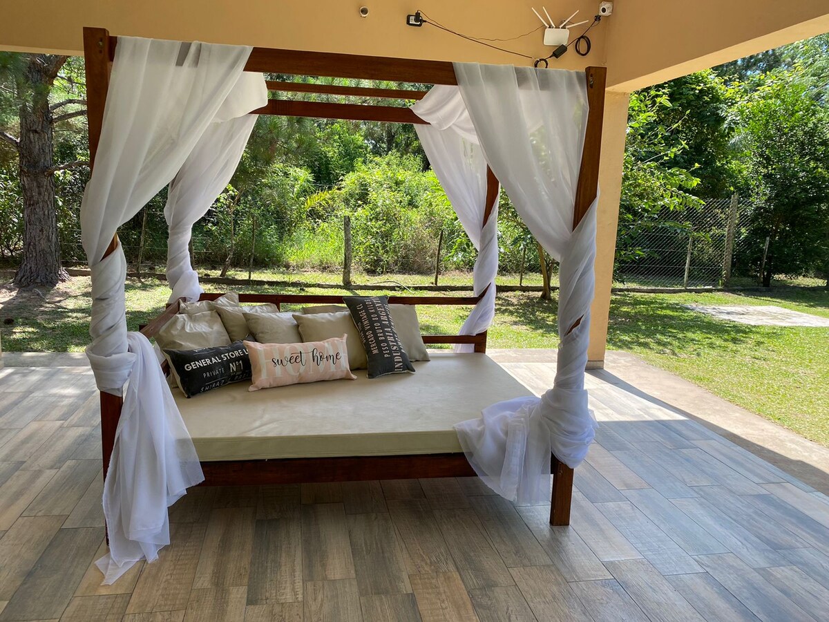 Un refugio en la naturaleza, a 15 minutos de la costanera correntina. En esta experiencia podes disfrutar de: Casa completamente equipada de lujo, con 3 habitaciones y dos baños, 3 hectáreas de espacios verdes, piscina y reposeras, cancha de futbol 5, cancha de básquet, fogonero, quincho techado y abierto, con 3 parrillas. Y mucho más...