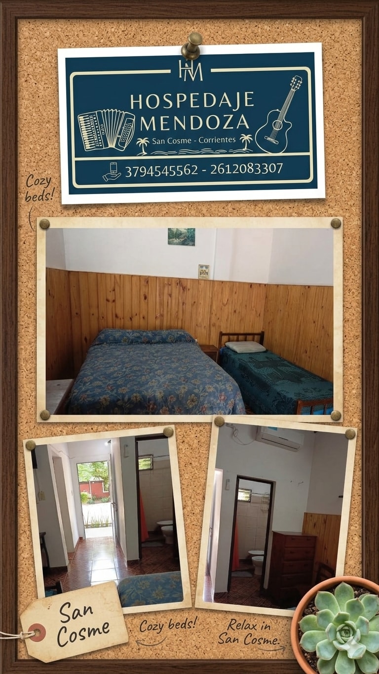 Hospedaje Mendoza, es un lugar ideal para Familias, Parejas o simplemente si buscas un lugar para descansar y continuar con viaje. Atendido por sus dueños. Precios accesibles, comodidad, seguridad, y lugar para vehículos. Contamos con WIFI; Aire Acondicionado; TVcable; Quincho. Estamos Ubicados en San Cosme - Corrientes a dos cuadras de Ruta Nacional 12 Búscanos en Google Maps, redes IG y FACE como: Hospedaje Mendoza
