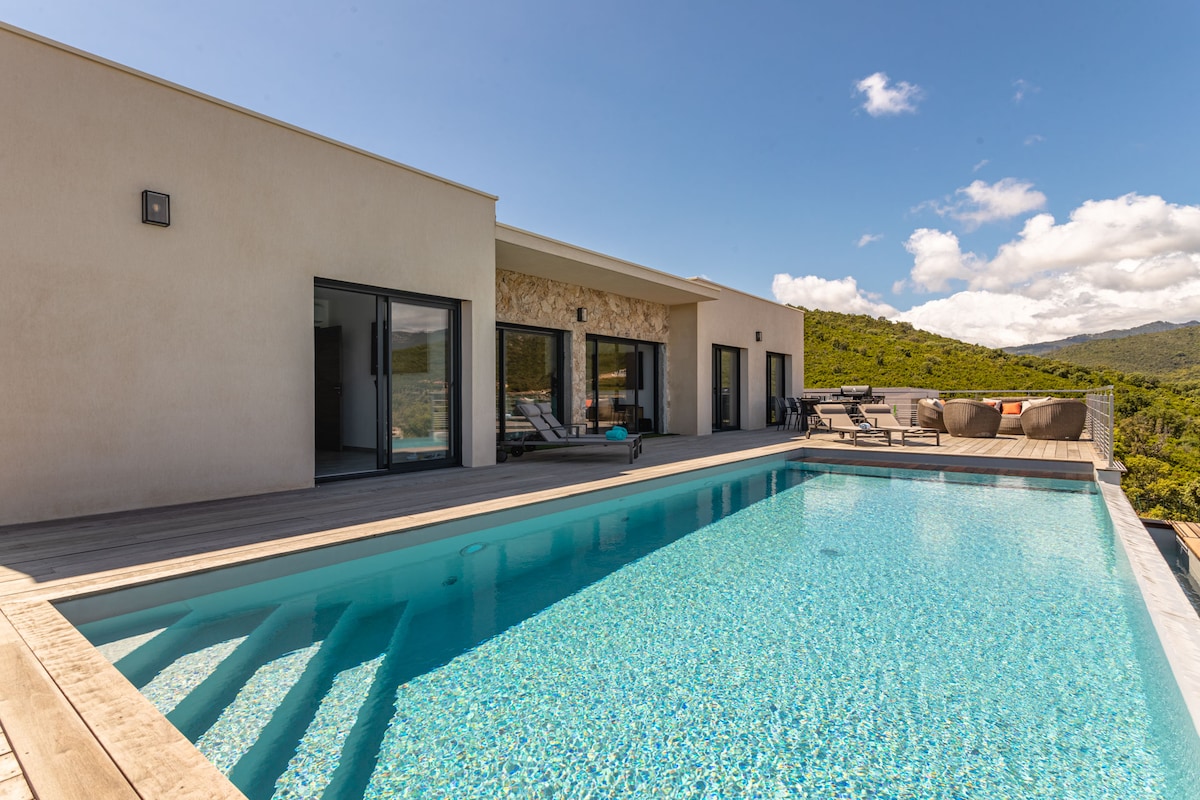 VILLA MAMONE CORSE DU SUD– 10p – VUE MER – PISCINE PRIVEE CHAUFFEE - 5 CHAMBRES – 10 COUCHAGES – 2 SALLES DE BAIN – PRIVATE PUTTING GREEN - PLAGE FAVONE 5min – Porto Vecchio à 30 min en voiture A 5 min de la plage de Favone, posez vos valises dans cette villa lumineuse, moderne de 136m2 et profitez d’une vue panoramique de votre terrasse sur mer et montagne.