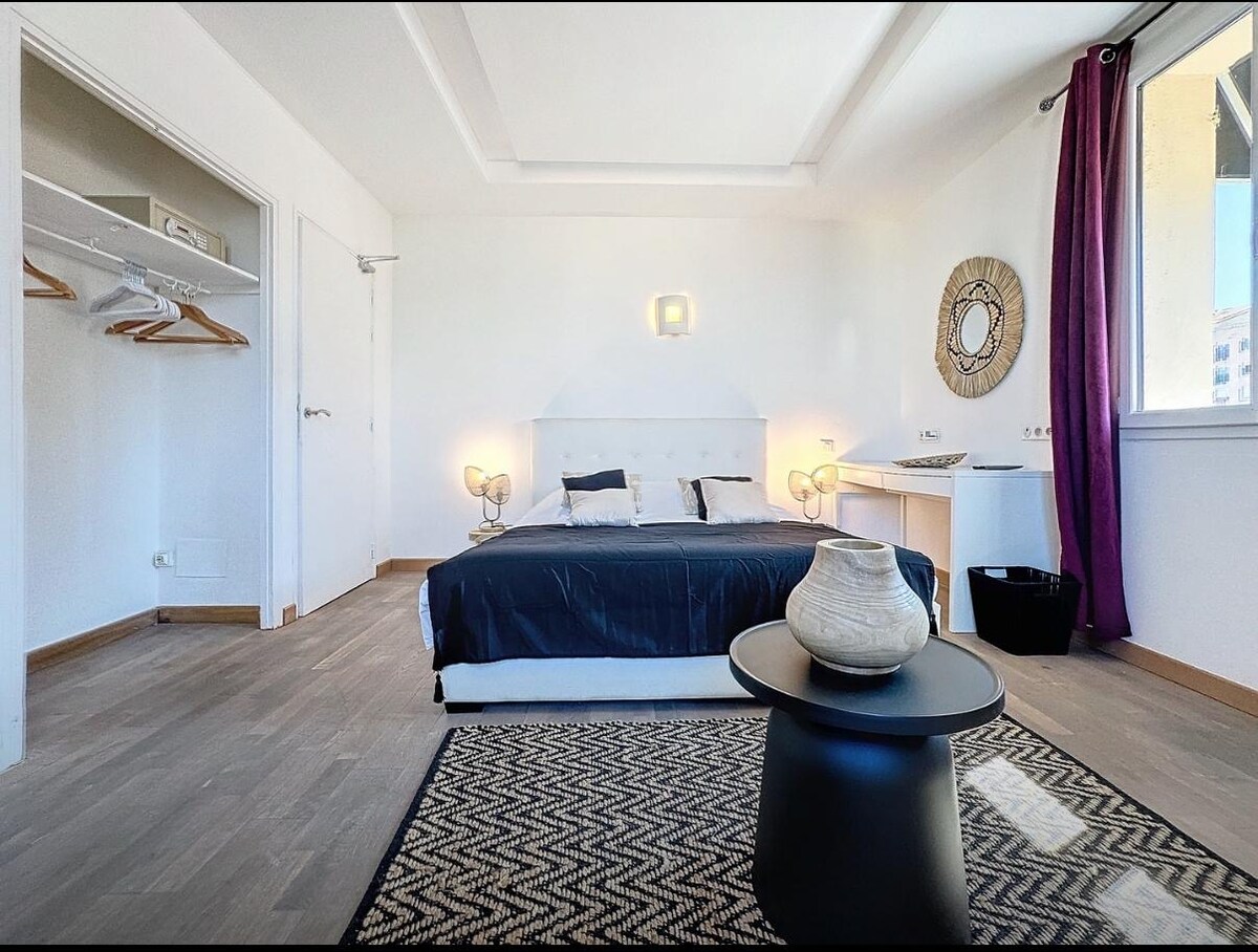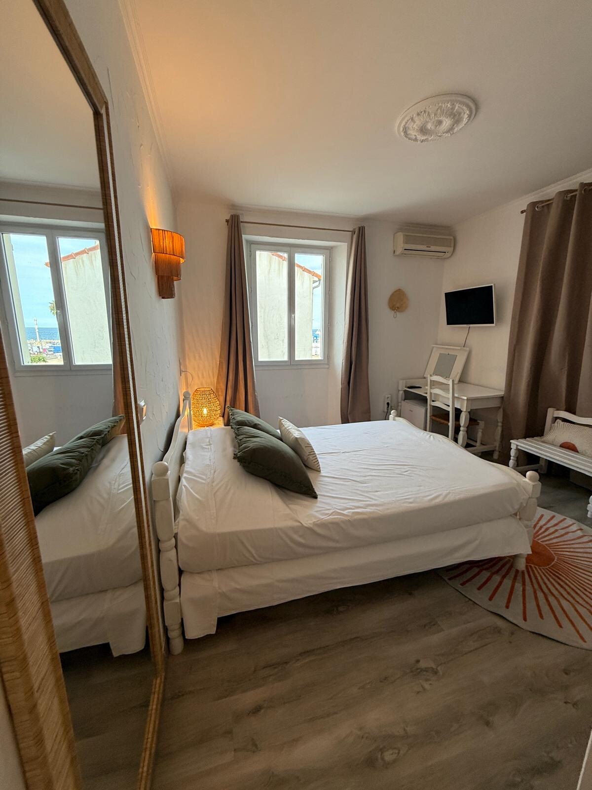 Chambre double 15m² avec balcon Vue montagne et mer. Confort et charme au rendez-vous dans cette chambre avec lit queen-size (160x200), balcon privatif offrant une superbe vue montagne et mer, douche spacieuse (120x90), climatisation, Wi-Fi, TV, mini frigo. Parfait pour un séjour à deux en toute tranquillité.
