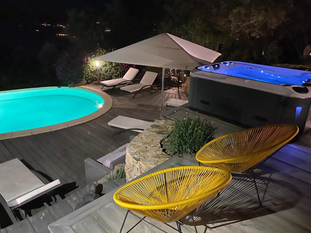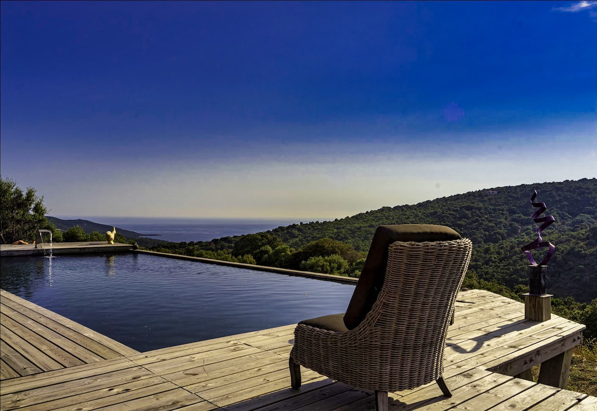 Profitez de ce point de vu EXCEPTIONNEL et UNIQUE ! De votre chambre ,je dirais même mieux de votre lit vous surplomberez la baie de Calcatoggio à Cargèse , vous pourrez jouir d’une piscine avec un lit baldaquin pour apprécier les couchés de soleil ainsi que d’un jacuzzi avec sa petite paillote… d’une table de billard , ping pong , fléchettes bref notre havre de paix nous voulons le partager car nous nous sentons privilégié et souhaitons vous en faire profiter.