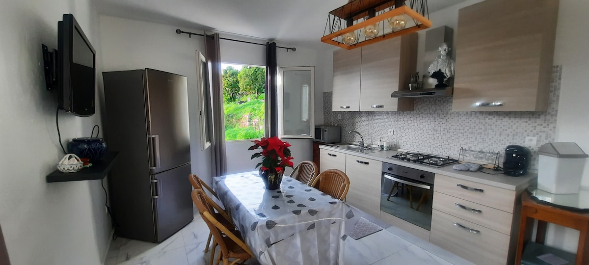 Charmant studio de 35 m2 au village, dans une propriété familiale entre mer et maquis. Il est situé à 15 mn en voiture du centre ville. Ce logement en rez de chaussée de villa vous charmera avec son style des plus cosy. Il est entièrement équipé et tout neuf. Une magnifique terrasse de 40m2 terminée par une petite piscine privée vous apporteront fraîcheur et tranquillité. Il se situe à 6min en voiture des plages de Lava et le magnifique village de Villanova est à 2km, avec plusieurs sentiers.