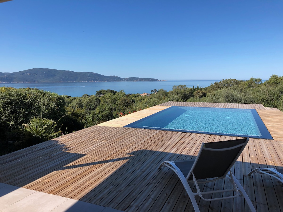 Cette villa de luxe possède une vue imprenable sur le fond du golfe du Valinco . Située dans une petite résidence de tourisme elle fait partie d'un programme de construction de 2 villas. Elle dispose d’une piscinella privée chauffée attenante à la terrasse . La deuxième villa du programme est connexe mais non mitoyenne. Cette prestation bénéficie d’un calme et d’une vue que nos hôtes recherchent et permet d’accueillir une famille sur plusieurs générations. Prestation recherchée