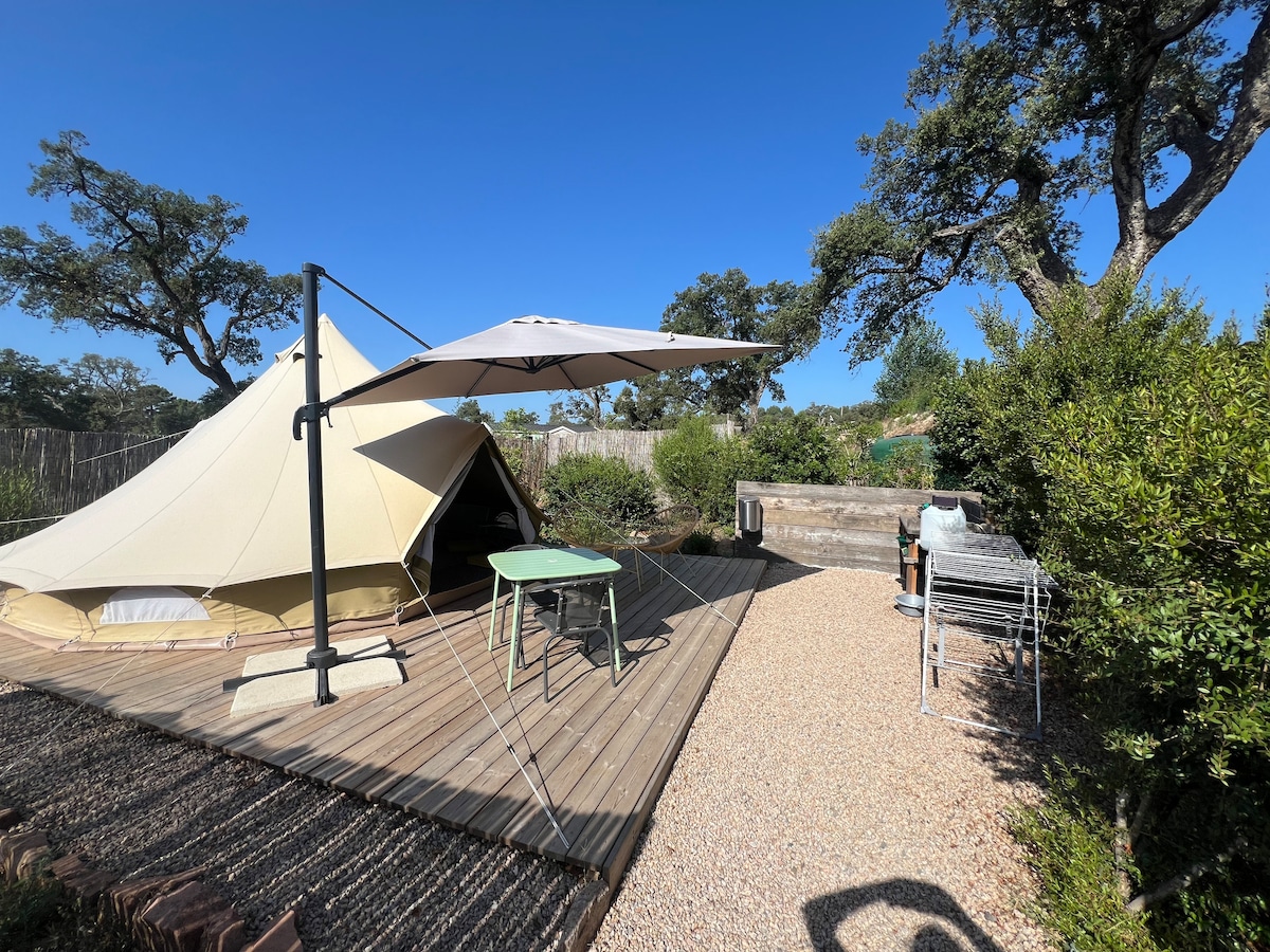 Tente de 25 m2 sur un terrain privé de 2000 m2, en plein cœur du domaine de Paviglia, vue sur Ajaccio 10 min de Porticcio ses plus belles plages restaurants. Coin cuisine avec eau chaude froide plaque vitrocéramique Nespresso micro-ondes réfrigérateur tv 2 chambres avec penderie, 1 couchage en 140 et 2 en 90 SDB mitoyenne lave linge douche lavabo WC. Piscine bois 8/4m semi-ent, mobilier de jardin barbecue. L'accès se termine par une piste en terre de 500 m ne convenant pas aux véhicule bas