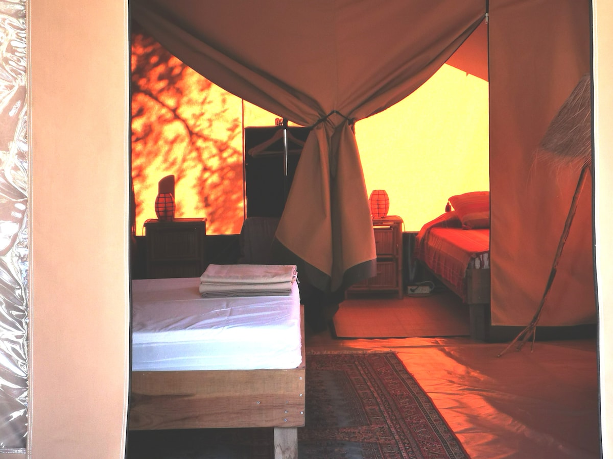 Tente louée avec un vrai grand matelas mousse Prix variable selon le nombre de personnes Petite table à côté Le drap housse est fourni, mais pas le reste Un hangar est aménagé avec réfrigérateurs, micro-ondes, bouilloire, table et bancs pour faire votre cuisine Le bloc sanitaire comprend des douches chaudes à volonté, bac vaisselle et linge. Machine à laver et sèche linge avec des jetons Accès wi-fi et recharge gratuit dans la véranda Facile d'accès, par le train gare de Tattone et la T20
