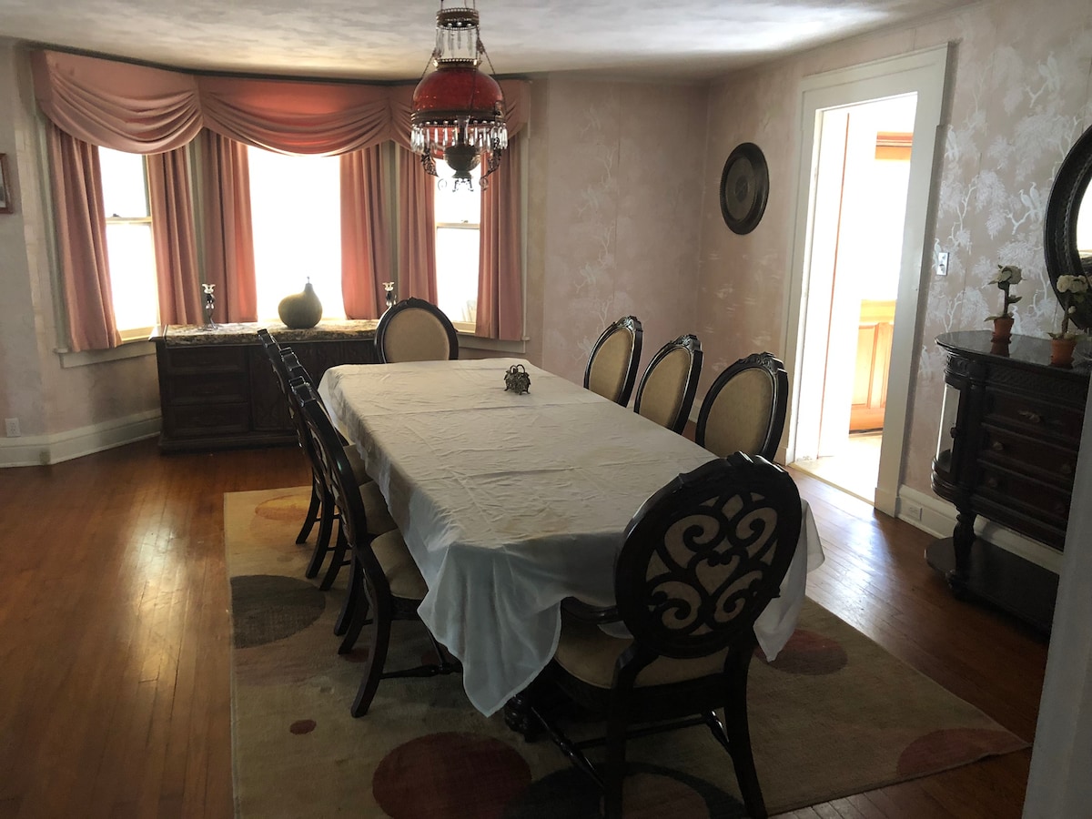 This is an 1890 house, with a train station theme. You'll enjoy the comfort of large spaces and plenty of seating everywhere. Enjoy a mini games table. Every seat in the living room has a clear view of a 65" TV. The dining room has a train station diner vibe, with a menu and vending signs. The kitchen is fully stocked with plenty of dishes and a large refrigerator. Upstairs there are 3 spacious bedrooms with room darkening curtains and soothing decor for restful nights. There's also an office.