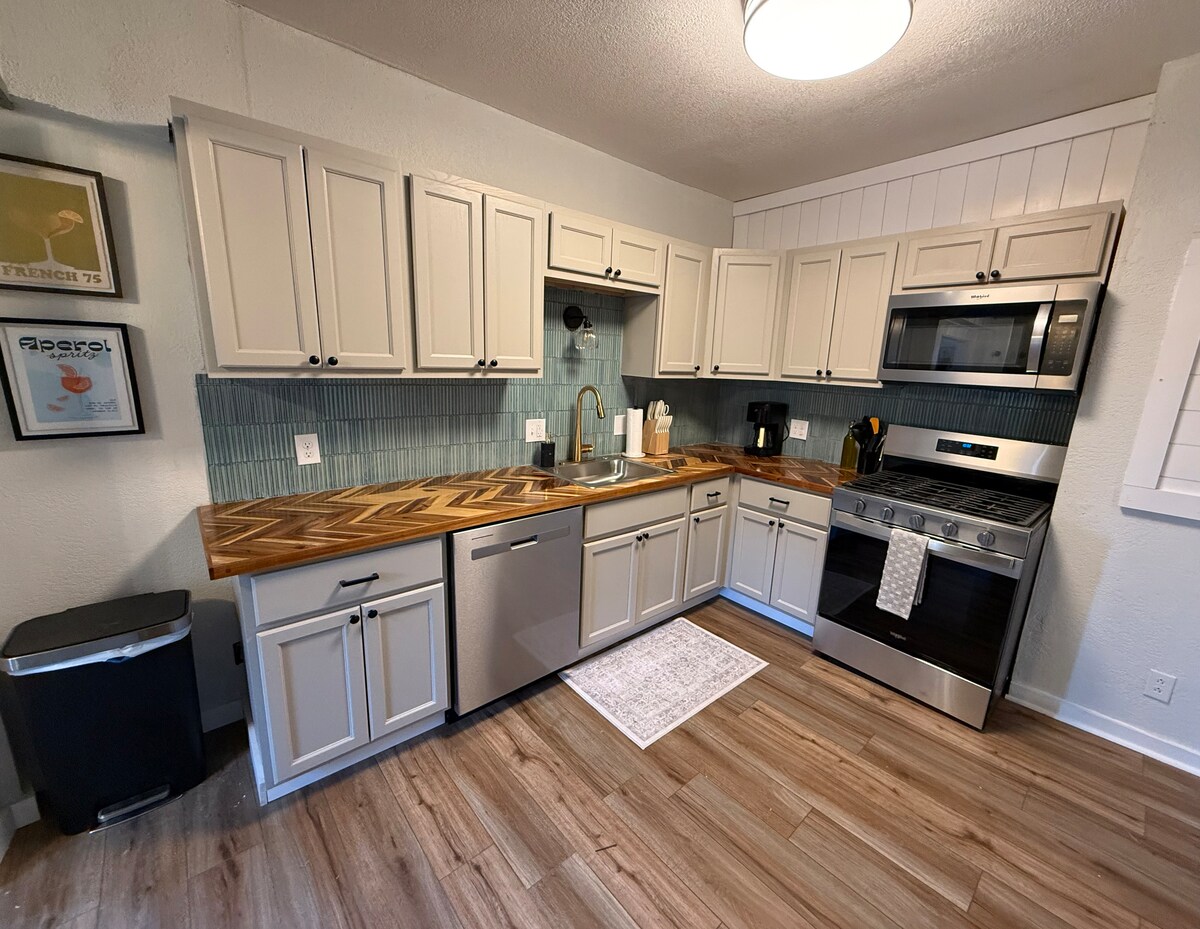 This is an 1890 house, with a train station theme. You'll enjoy the comfort of large spaces and plenty of seating everywhere. Enjoy a mini games table. Every seat in the living room has a clear view of a 65" TV. The dining room has a train station diner vibe, with a menu and vending signs. The kitchen is fully stocked with plenty of dishes and a large refrigerator. Upstairs there are 3 spacious bedrooms with room darkening curtains and soothing decor for restful nights. There's also an office.