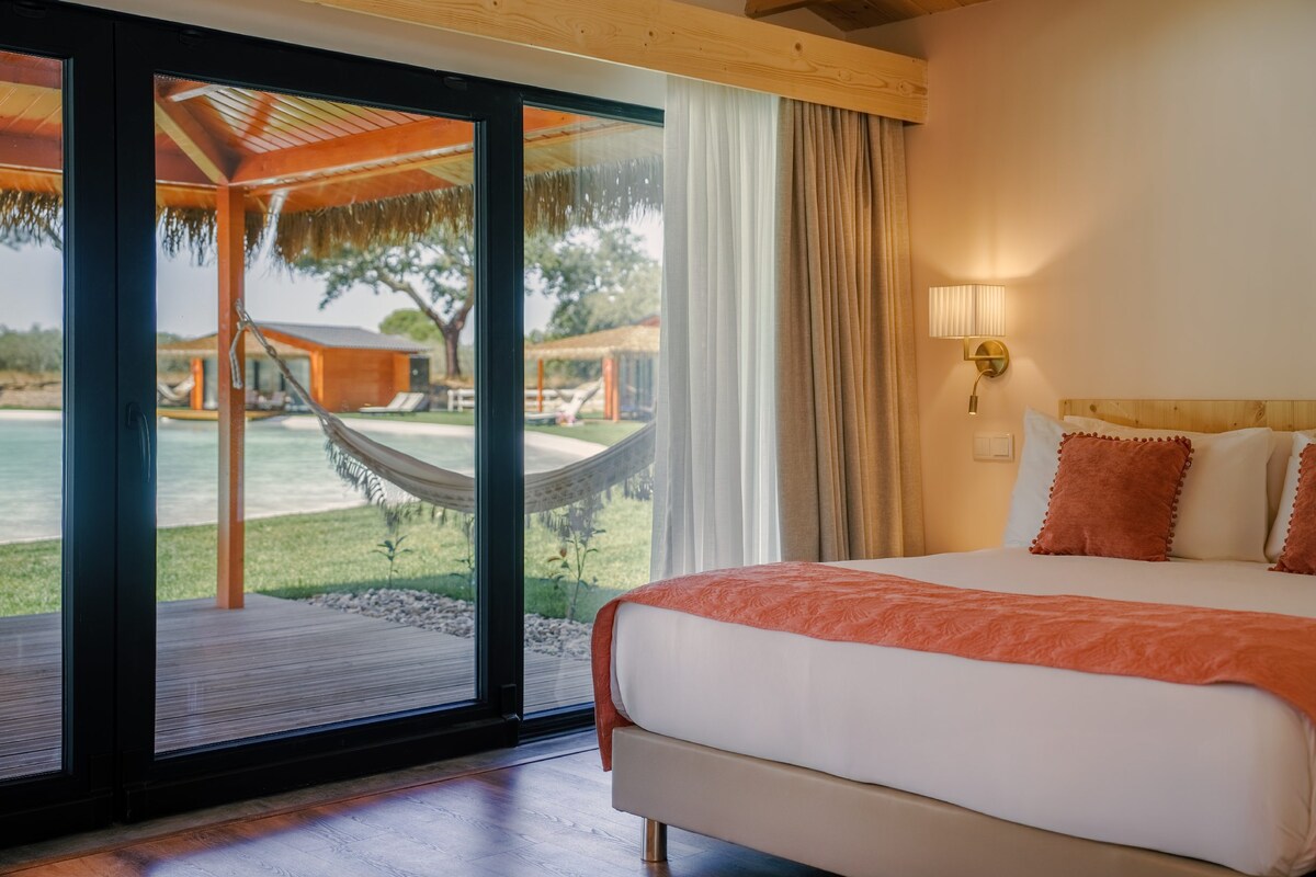 Bungalow em open space com cama king size ou duas camas individuais (twin), ideal para casais ou amigos. Dispõe de casa de banho privativa, sofá-cama para uma criança, ar condicionado, televisão de ecrã plano e terraço mobilado com vista para a piscina-lago. Perfeito para uma estadia tranquila e confortável em contacto com a natureza.