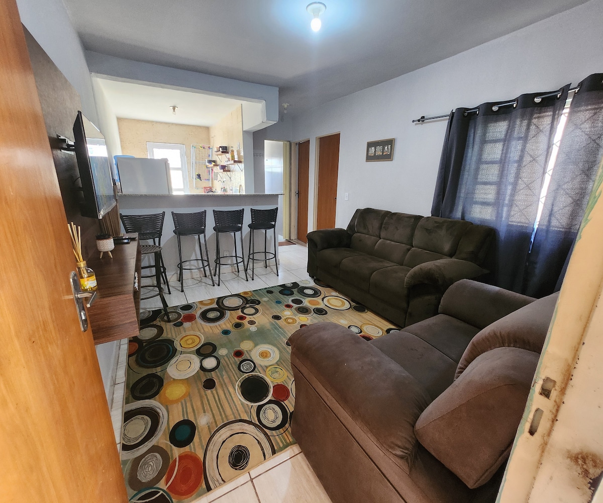 BEM VINDO à nossa casa de hospedes, um ambiente muito tranquilo para ficar com a família. Na casa: -Acomoda até 4 pessoas(2 delas são bi cama na sala ou colchão extra no quarto) -Ar condicionado SOMENTE no quarto. -Smart TV na sala -WIFI -Cozinha -Garagem para 1 carro