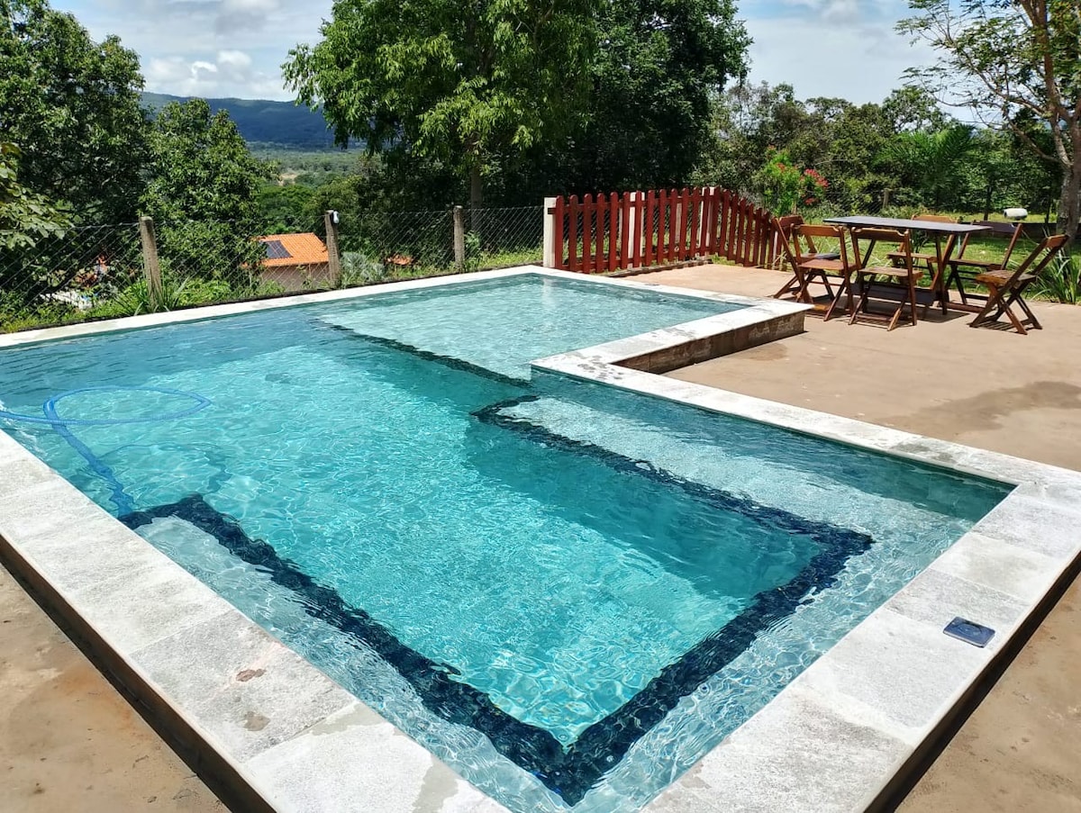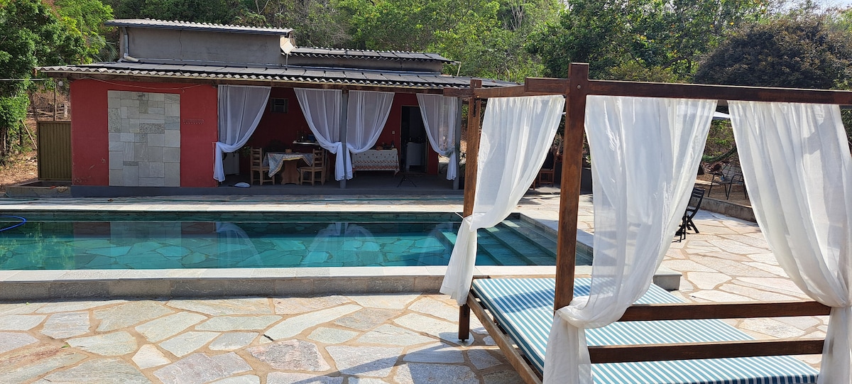 Chalé aconchegante cercado de mata, acesso exclusivo à cachoeira e dois poços de água limpa (5min a pé). Internet fibra óptica. Ideal para um casal (até 04). Não recomendável para idosos (70+), bebês ou crianças pequenas. Ler observações. Permitido pet de pequeno porte.A 10km do centro de Pirenópolis (25 min carro) pela Serra dos Pirineus, 5 Km de estrada de terra acidentada. Ambiente rústico em contraste ao meio urbano: água, céu, mata de cerrado e paz. Propício ao recolhimento e introspecção.