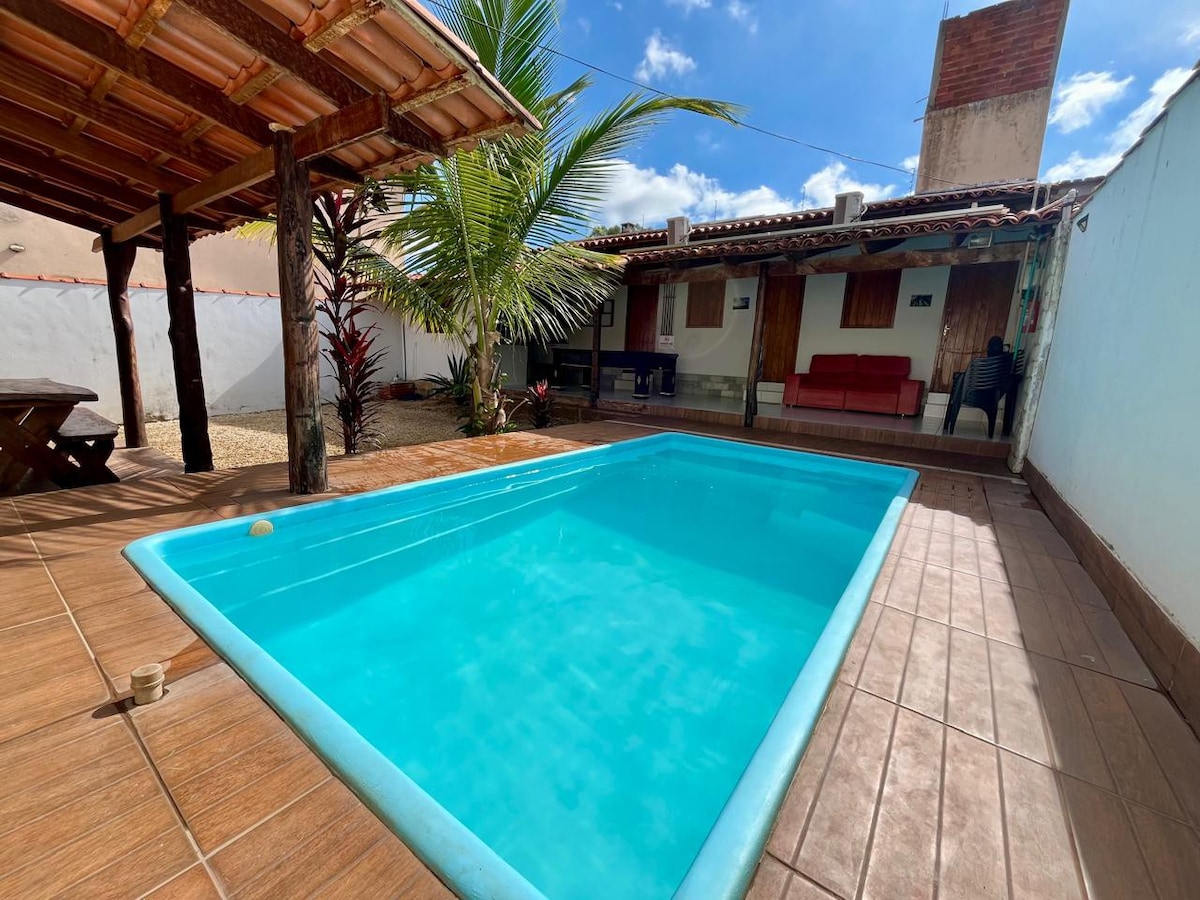 Casa nova, bem localizada e bem equipada - AR CONDICIONADO nos quatro quartos -Capacidade para 15 pessoas incluindo crianças -4 Quartos ,4 Camas casal e 1 Quen sendo duas suítes -3 Colchões avulso Solteirão -1 Beliche no Quarto térreo -1 Wc Social térreo, 1 Wc área de lazer -Sala TV -Cozinha equipada, forno e filtro elétrico, fogão, geladeira, liquidificador, micro-ondas, etc... -Área de lazer, PISCINA AQUECIMENTO ELÉTRICO QUENTE 24H e iluminada, churrasqueira TOP, com grelha. -Garagem -Wi-fi