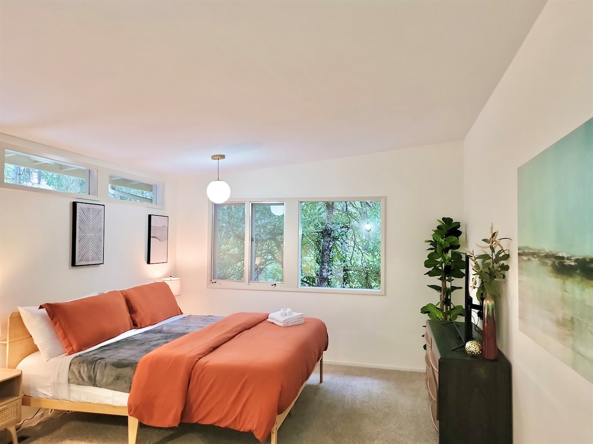 Wake up to serene river views in our thoughtfully designed room, complete with luxury bedding, local art, and a coffee maker to start your day right. Whether relaxing in a spacious seating area or at your workspace, you'll find comfort and convenience. Enjoy cycling the nearby paths or wine tasting in the celebrated Willamette Valley. After exploring, unwind on the sun terrace or rejuvenate in the custom hot tub. With local charm and easy access to downtown shops, your perfect getaway awaits.